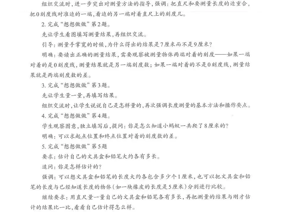 评价可以用多种方式进行。例如,评价学生是否建立了1厘米或几厘米的长度表象,可以看他们能否较为合理地比画出1厘米的长度,是否知道一些常见物体的长度是多少厘米;评价学生是否掌握用工具测量长度的一般方法,可以要求学生选择合适的工具测量相关物体的长度,观察他们的测量过程,比较他们的测量结果;评价学生能否合理估测物体的长度,可以选择不同的物体让学生进行估测,并要求他们说出估测的思考过程;评价学生是否了解长度单位与测量结果之间的关系,可以要求他们分别用不同的单位测量同一个物体的长度,并解释得到的数值为什么不同。