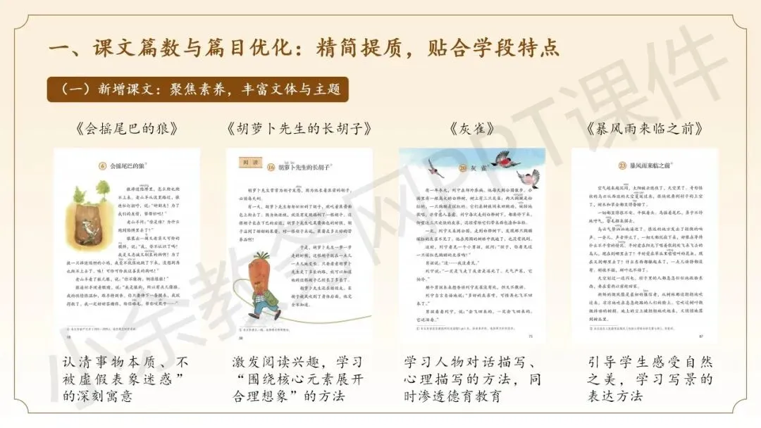 下面来看看这个三年级语文下册新教材整体解读 PPT 课件的内容预览吧。第一部分内容:《2026 年三年级下册语文新教材核心变化详解》这部分内容介绍三年级语文下册新教材的核心变化点,图文并茂,核心变化有哪些讲得非常详细,一句话总结就是,相比老版本教材,三年级语文新教材更科学、更实用、更有针对性。