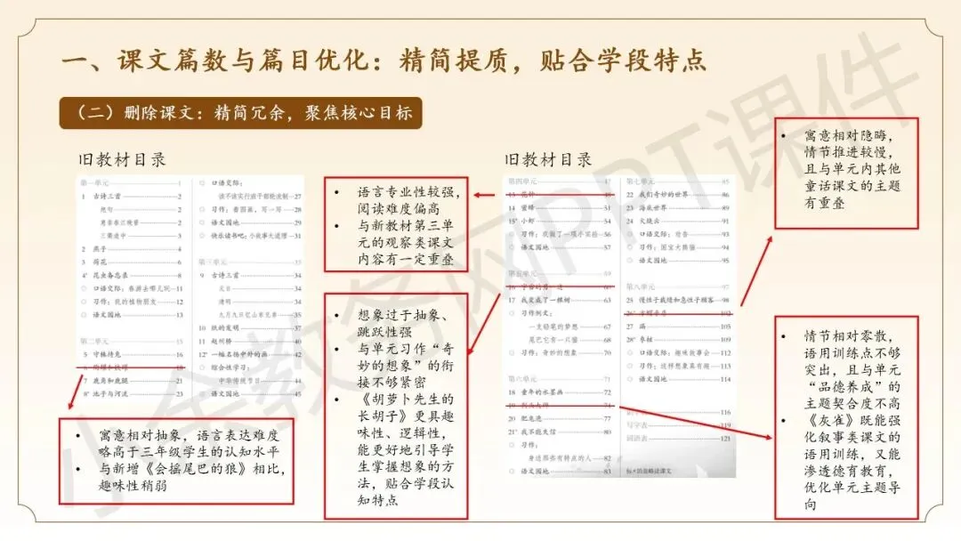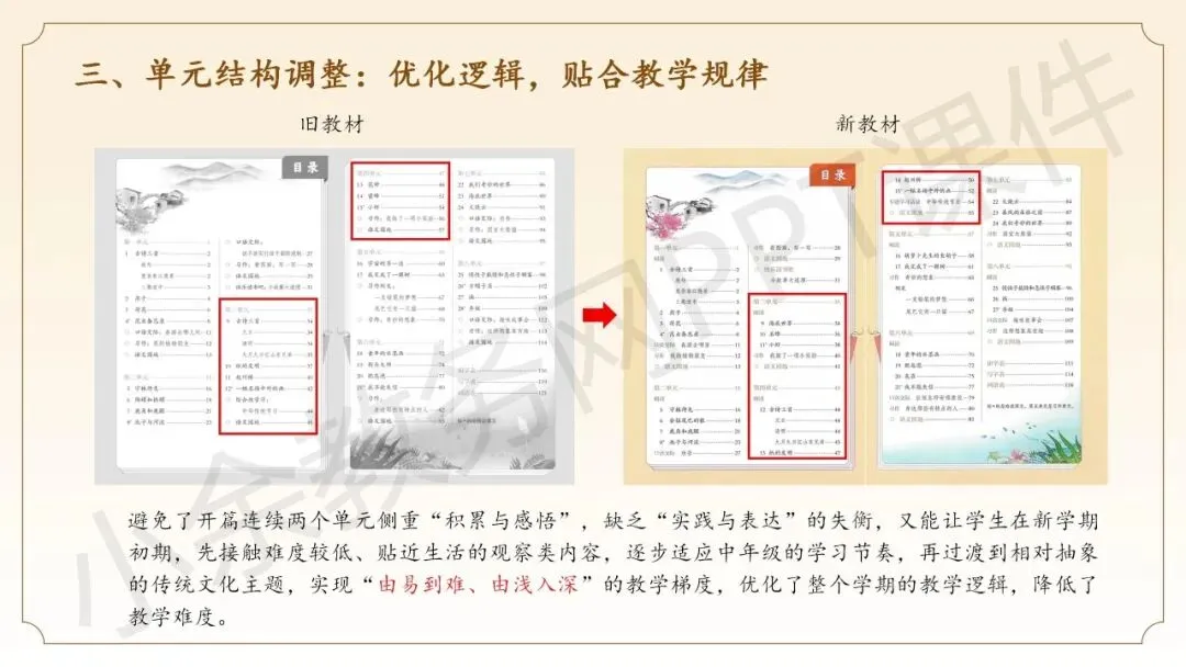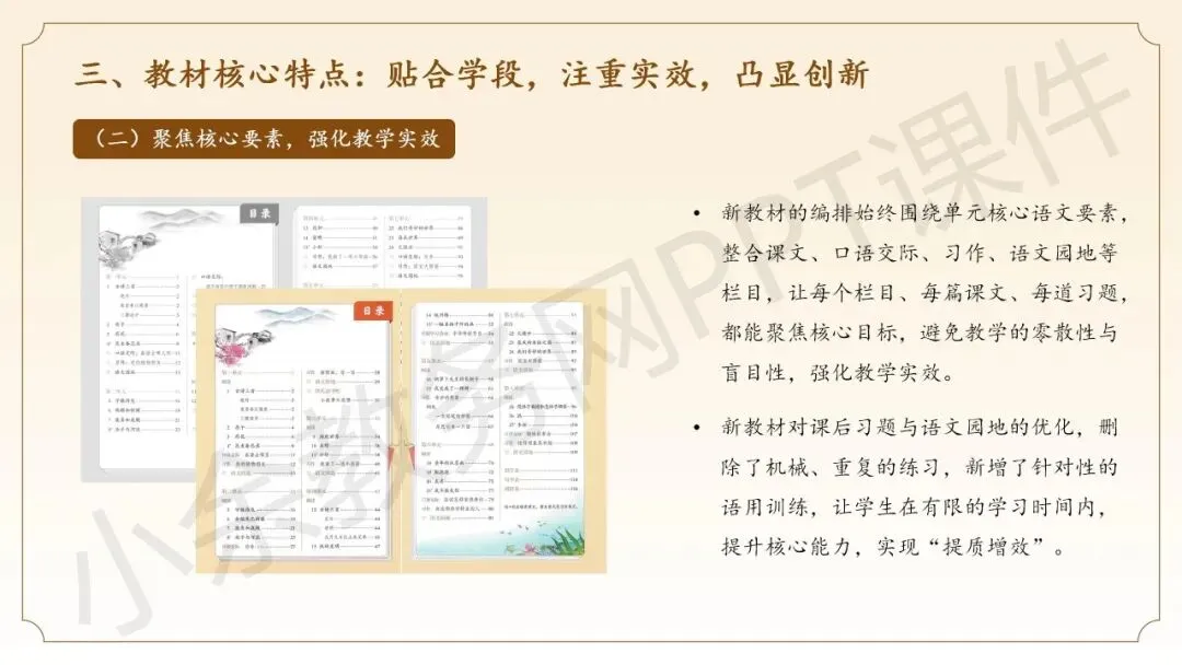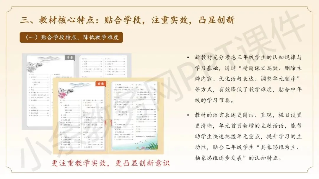 这个课件的内容不错哈,整个课件的内容都是围绕三年级语文下册新教材而展开,主要内容有三年级语文下册新教材核心变化详解、下册整体解读、下册教学建议,这些内容都非常实用哈。