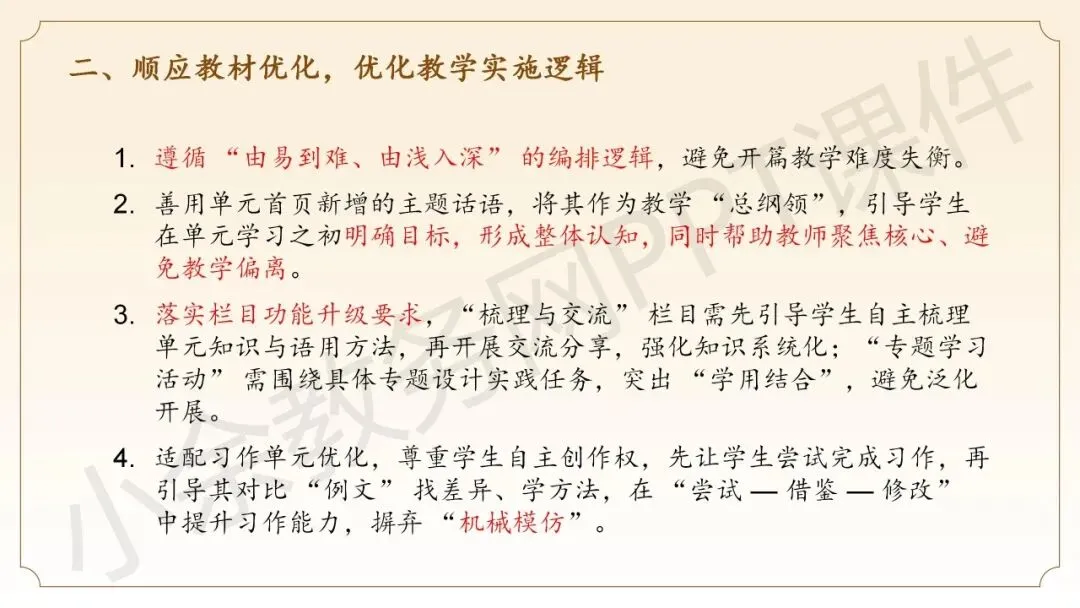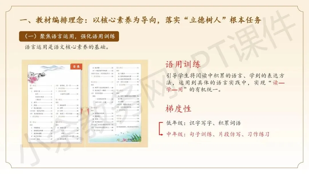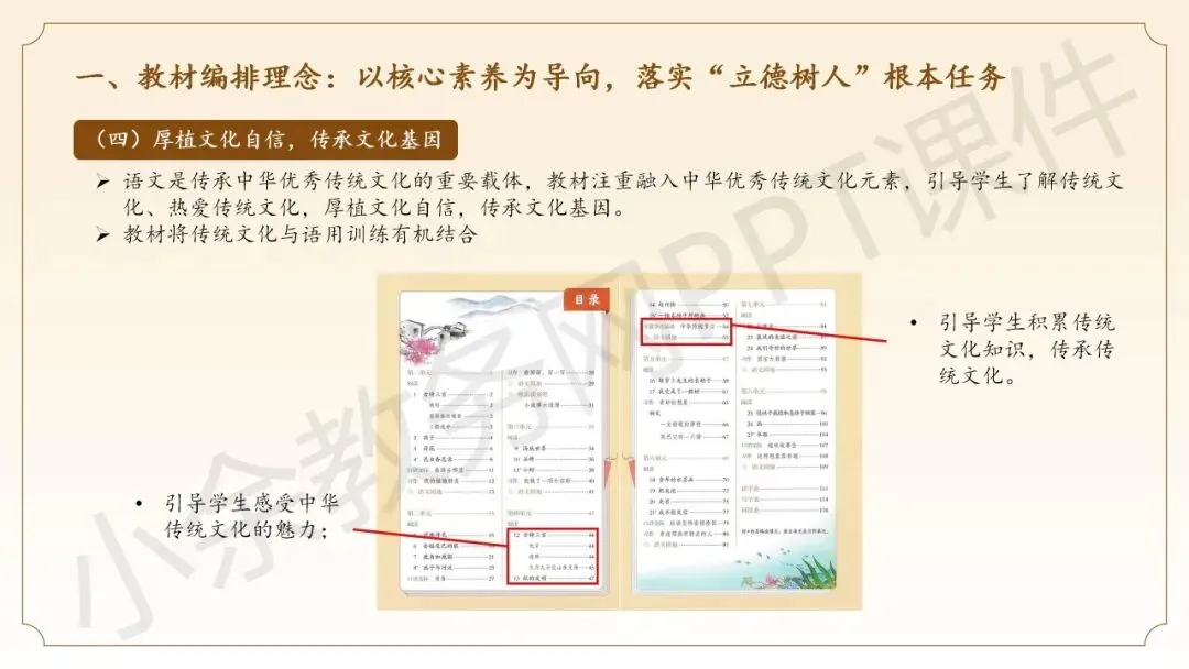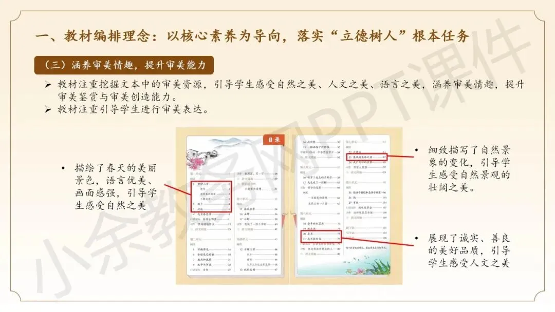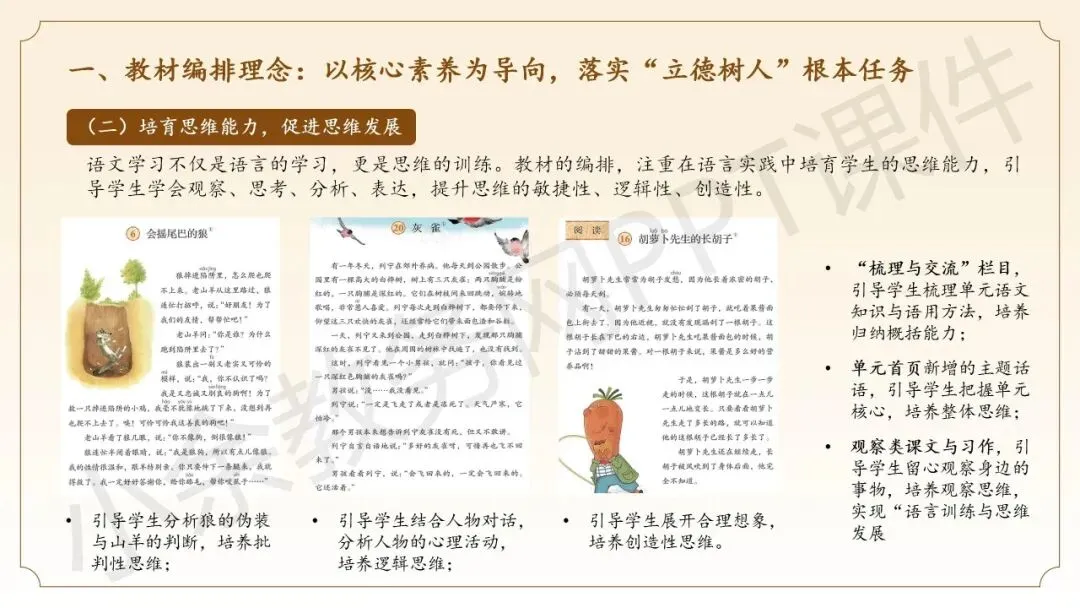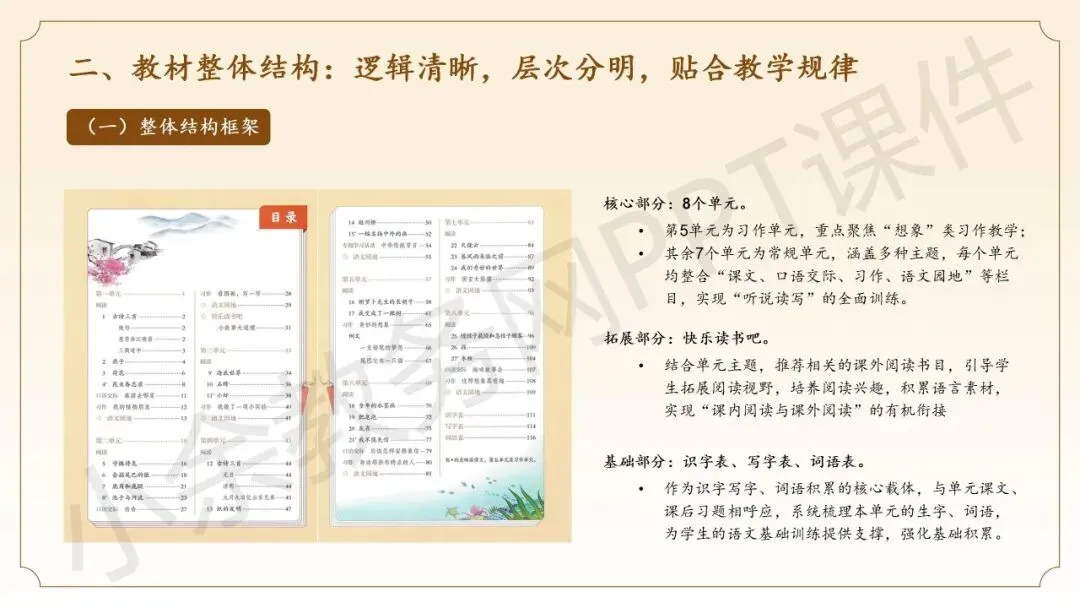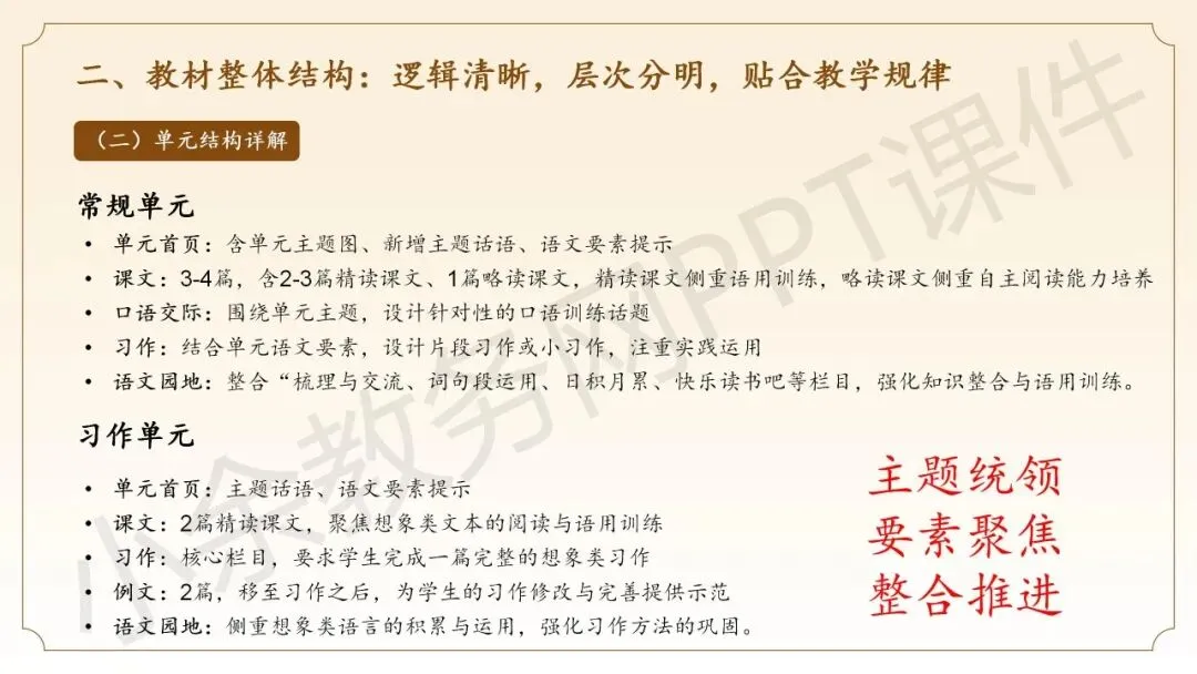 第二部分内容:《三年级下册语文新教材整体解析》这部分内容向语文老师同仁介绍三年级语文下册新教材的整体情况,分别从教材编排理念、教材整体结构、教材核心特点这三个方面来介绍。
