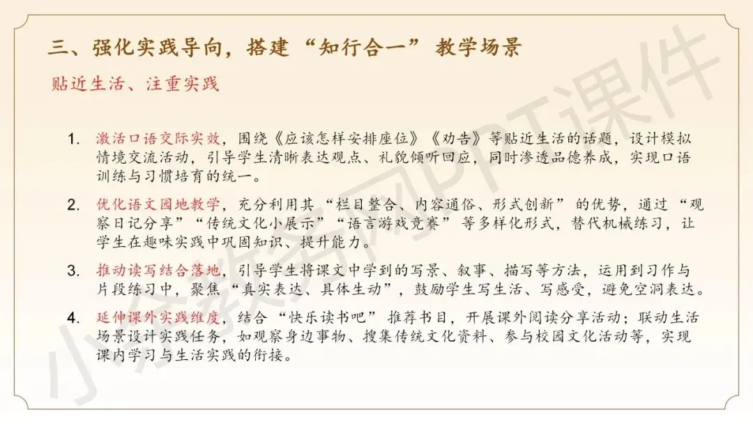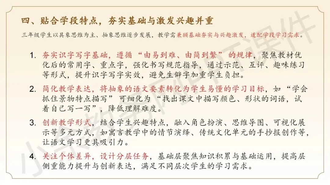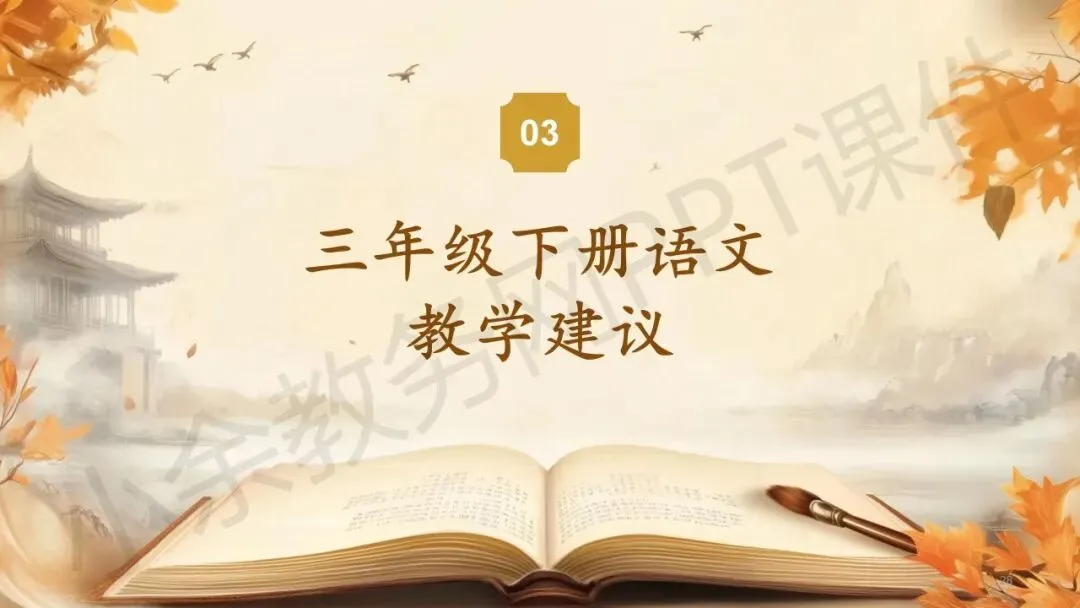 最后一部分内容:《三年级下册语文教学建议》这部分内容是关于给语文同仁三年级下册语文新教材的教学建议,这里提供的五个建议都非常实用,非常有借鉴参考价值。