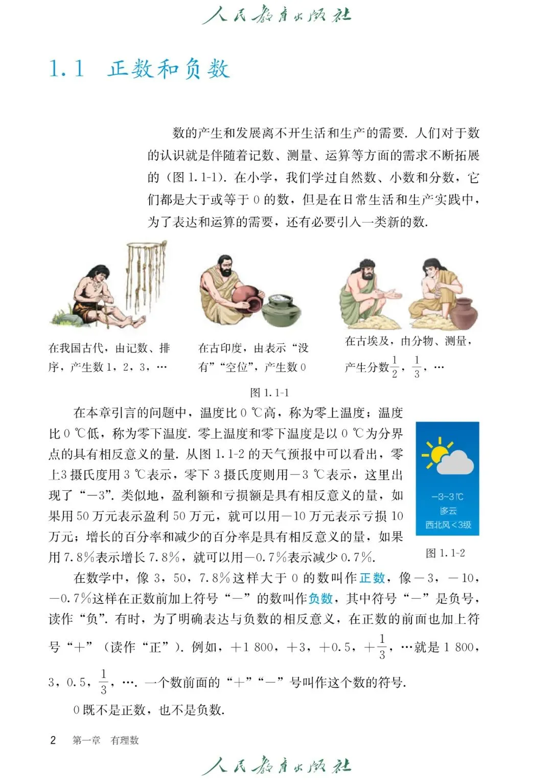 【1】第一章 有理数:正数与负数的概念;用正负数表示具有相反意义的实际量(如温度、海拔、收支等);有理数的定义及表示方法;数轴的建立与应用;有理数的大小比较(借助数轴和绝对值);绝对值的意义与性质;有理数的分类(整数、分数);负数产生的历史背景与数学意义。