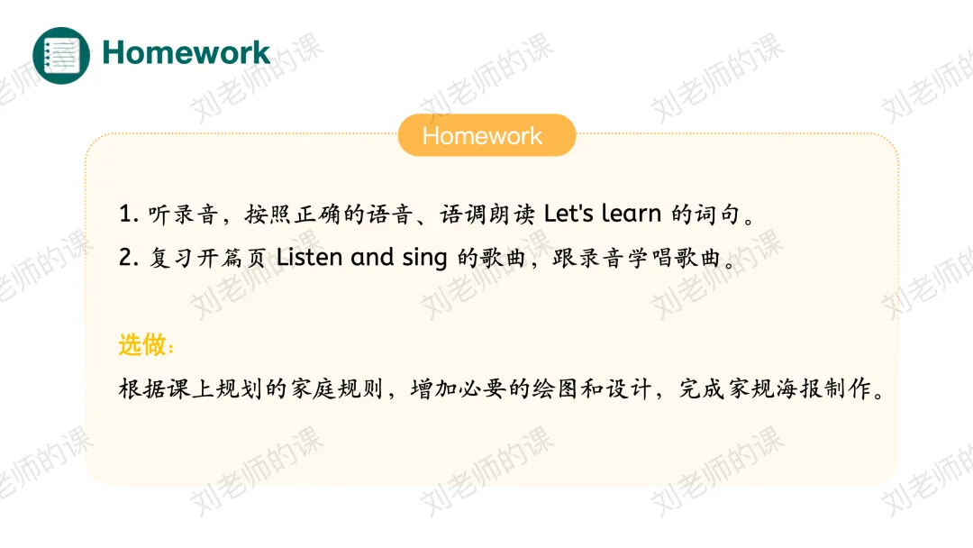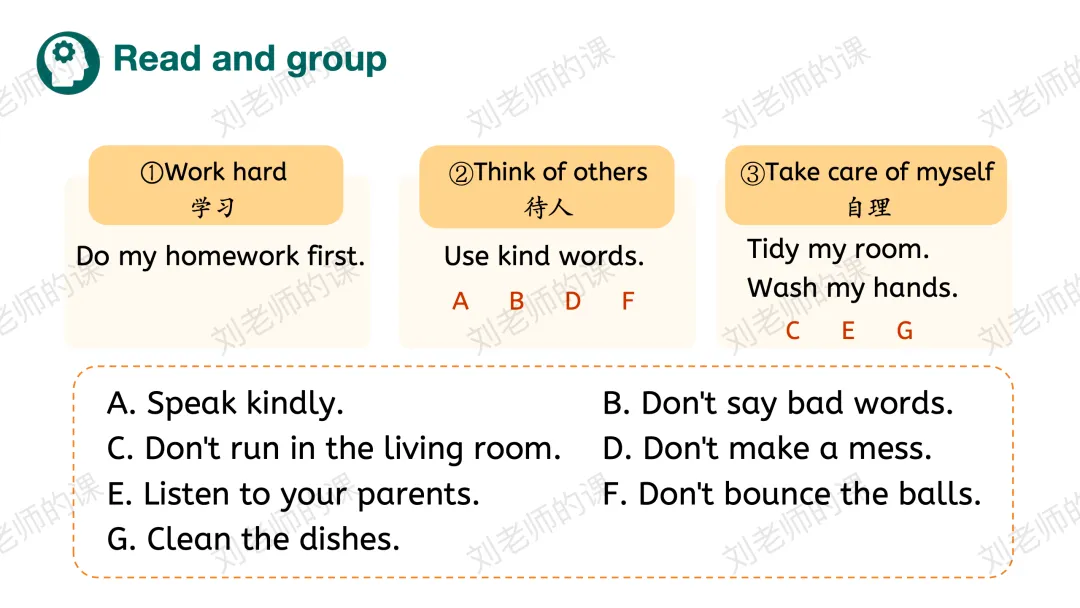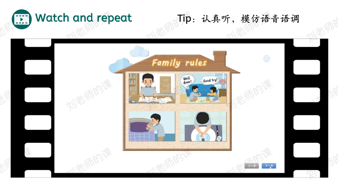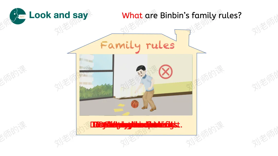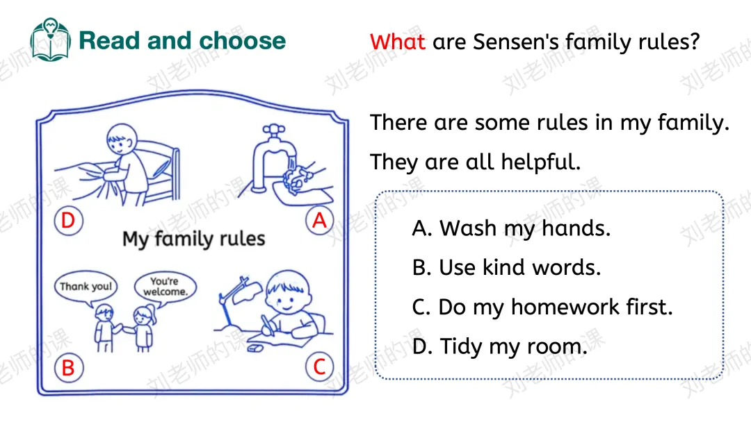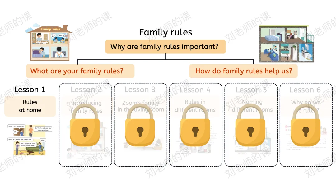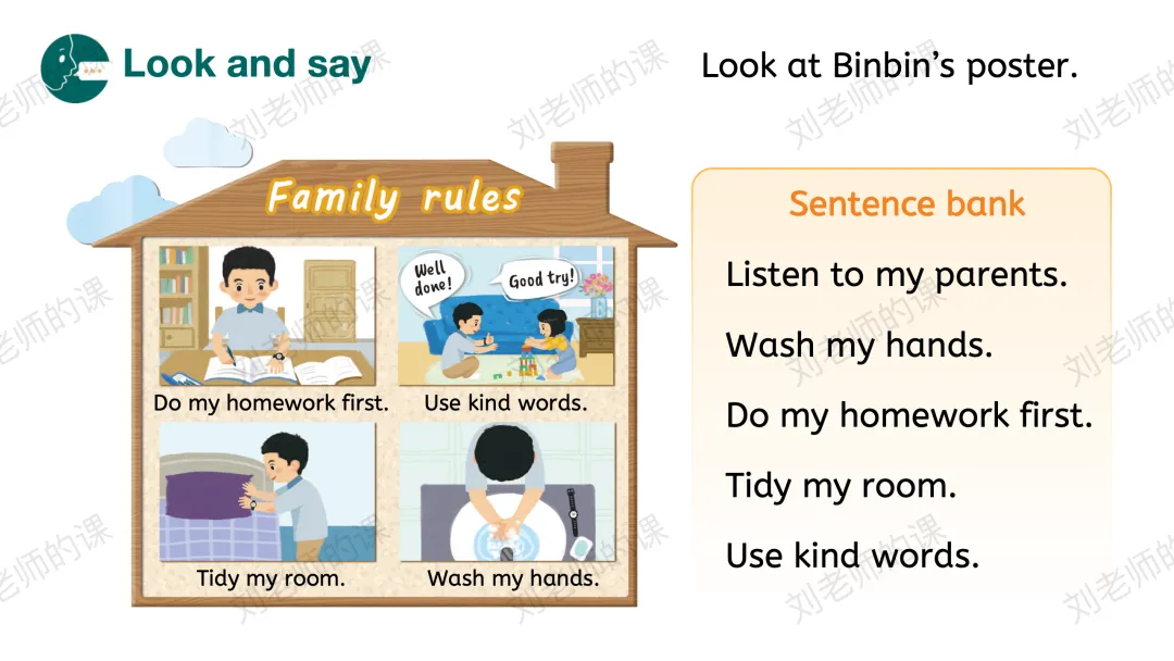 【获取与梳理】呈现Binbin制作的家规海报,通过图文匹配、听音排序、跟读、归类等内容内化语言。