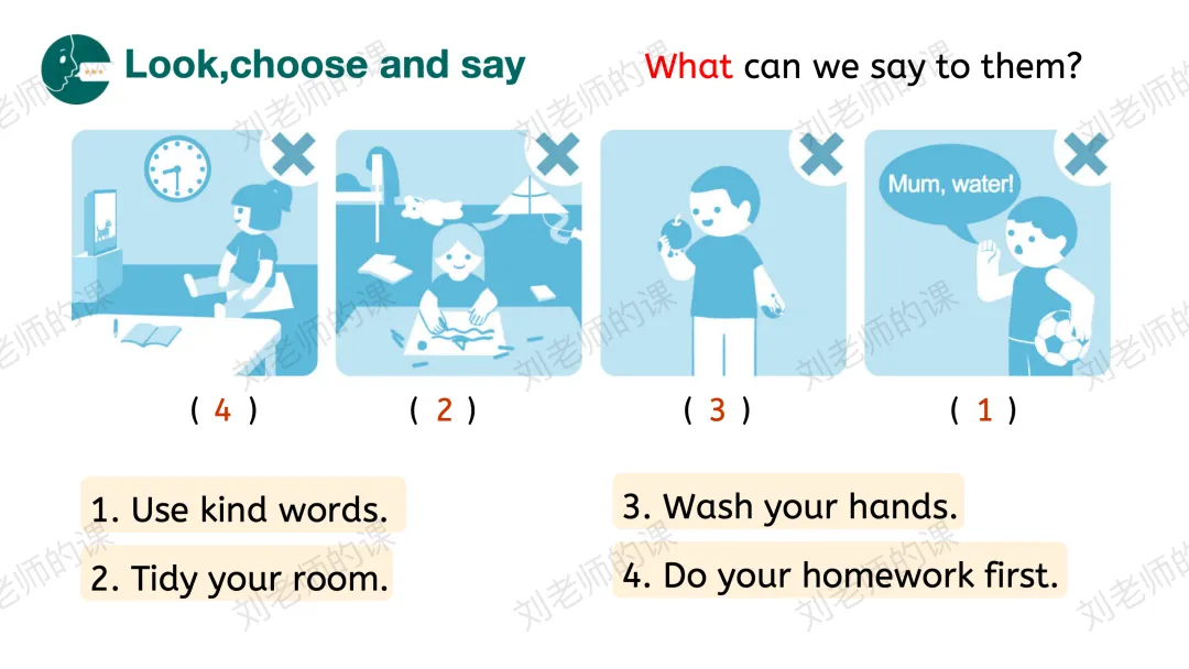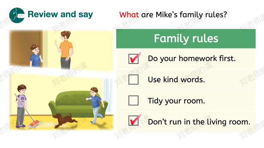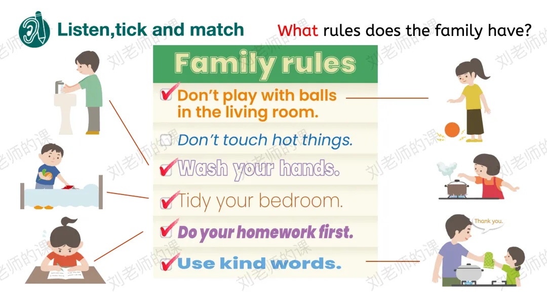 【内化与应用】呈现不同的生活场景,教师传递Family rules help us a lot. Look at these situations, what can we say to them?引导学生对不符合家规的行为提出建议。