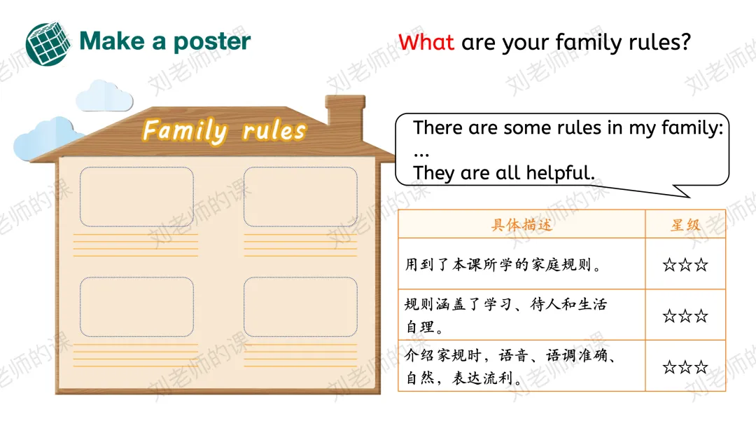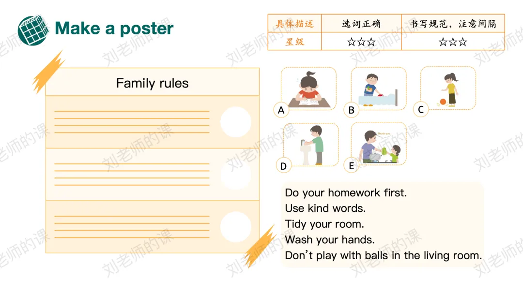 【内化于应用】从勾选家庭的规则、为家庭制作海报,到规则海报图文匹配,再到最后自己制作家规海报并汇报,逐步深化学生的语言运用能力。