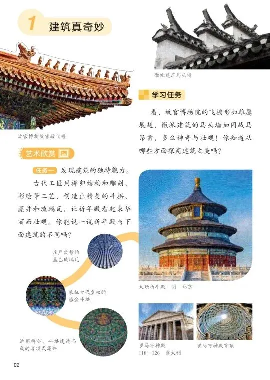 陈述:展示故宫飞檐、徽派马头墙、祈年殿、罗马万神殿图片,引导学生从造型、线条、材料等方面观察比较。