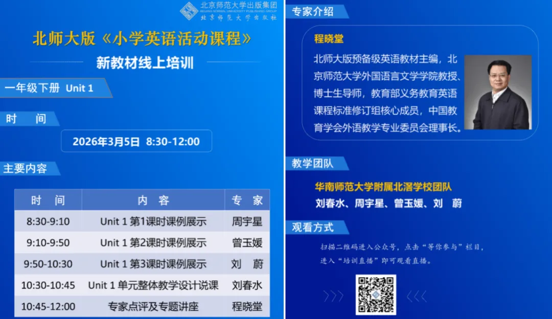 为深入贯彻《义务教育英语课程标准(2022年版)》理念,精准把握北师大版《小学英语活动课程》“活动引领、素养导向”的核心设计思想,2026年3月5日,由北京师范大学出版集团主办的一年级下册Unit 1Animals新教材全国线上培训顺利举行。