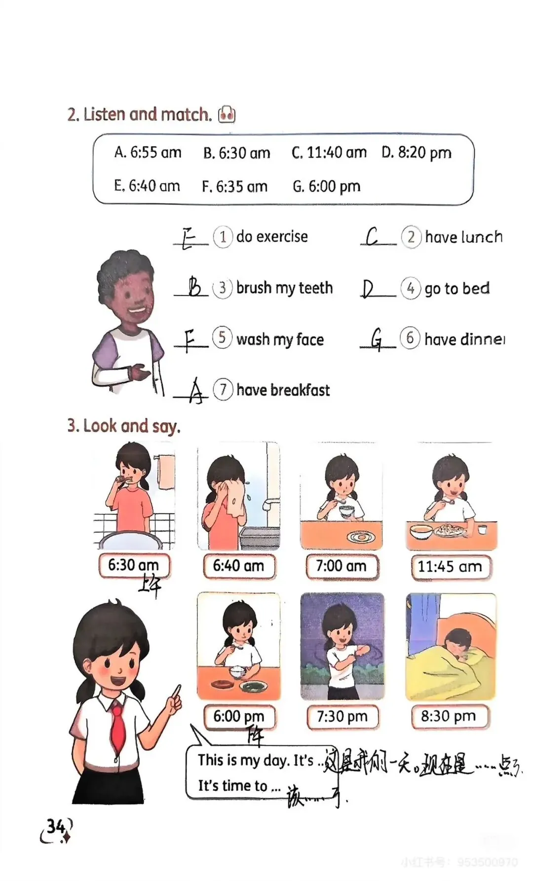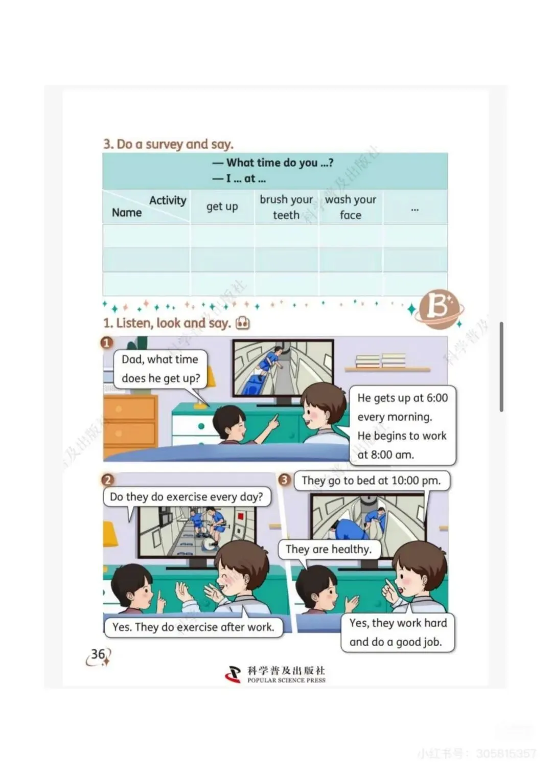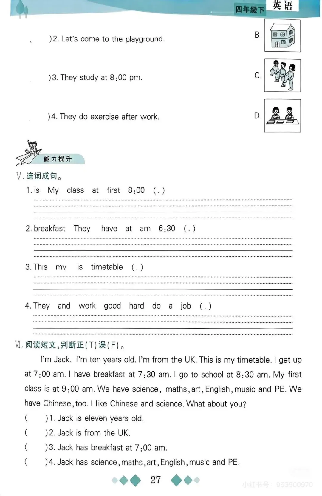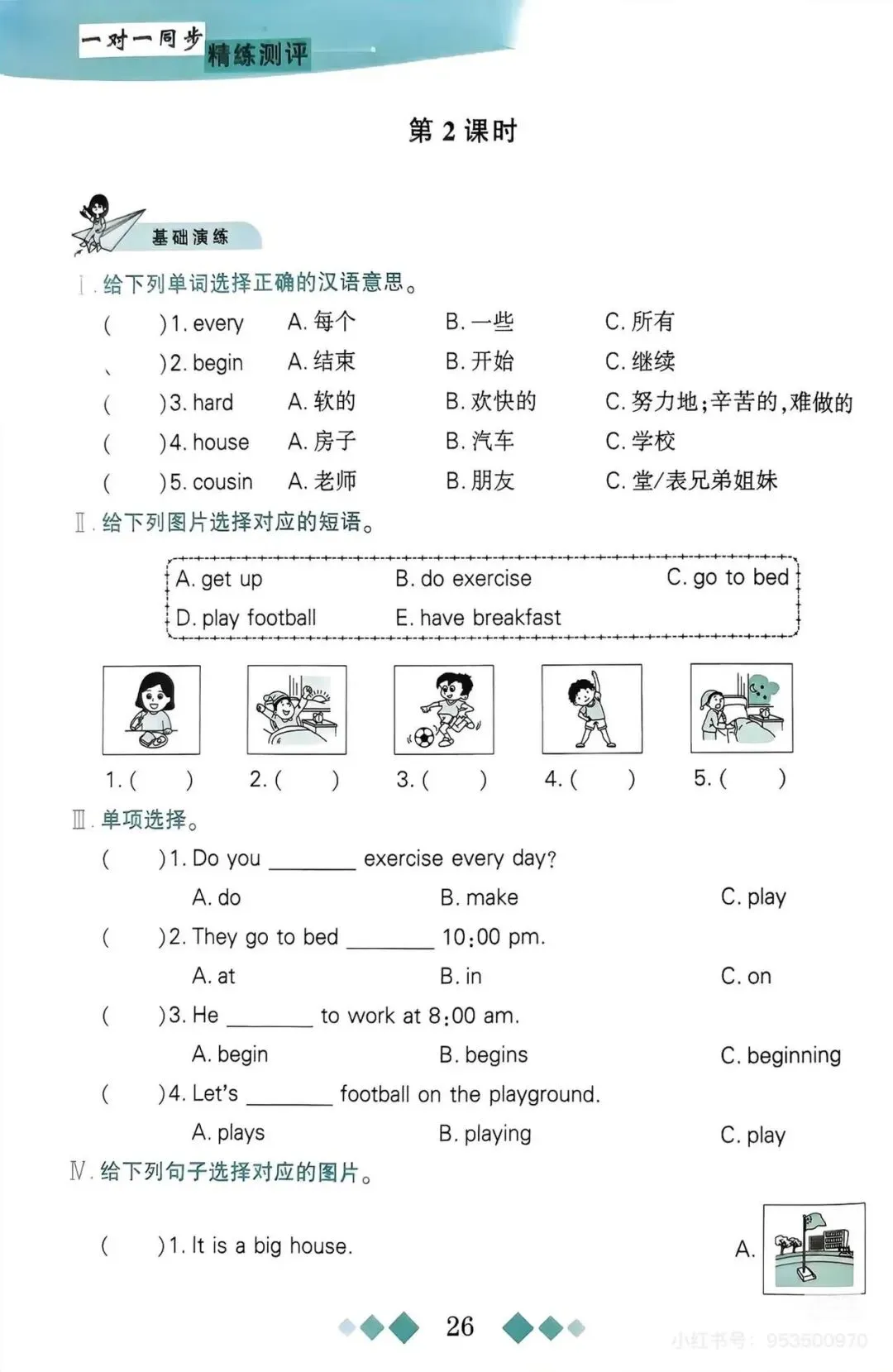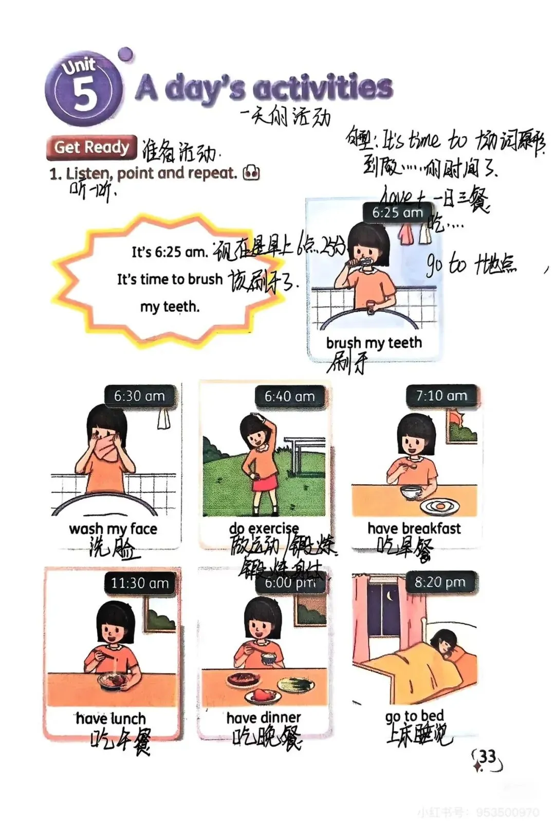 【2026年春期新教材】科普版小学英语四年级下册教材Unit5 A day's activities电子版,课堂笔记及练习题