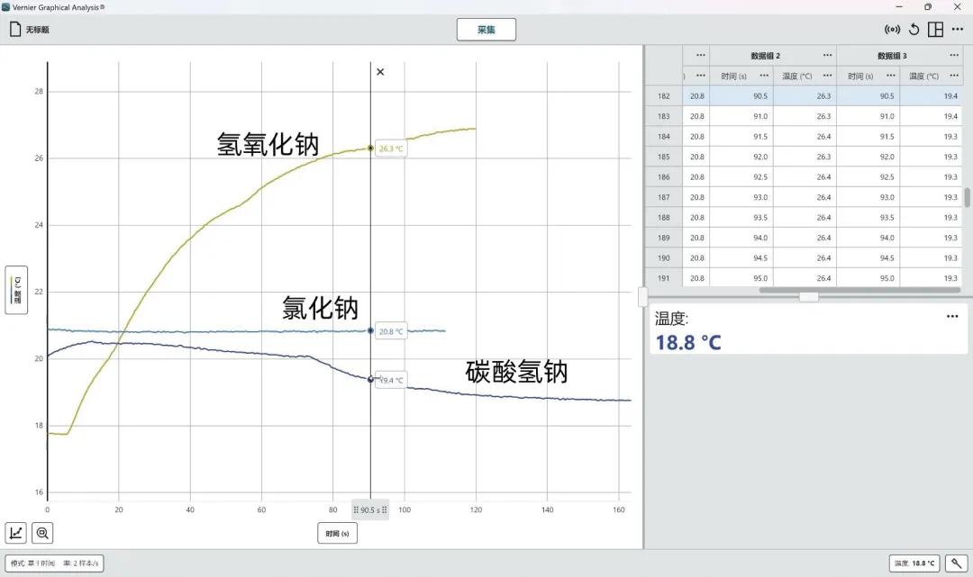 结合实验测得的数据可知:氢氧化钠固体溶于水时会释放热量;碳酸氢钠固体溶于水时会吸收热量;氯化钠固体溶于水时,溶液温度基本保持不变。