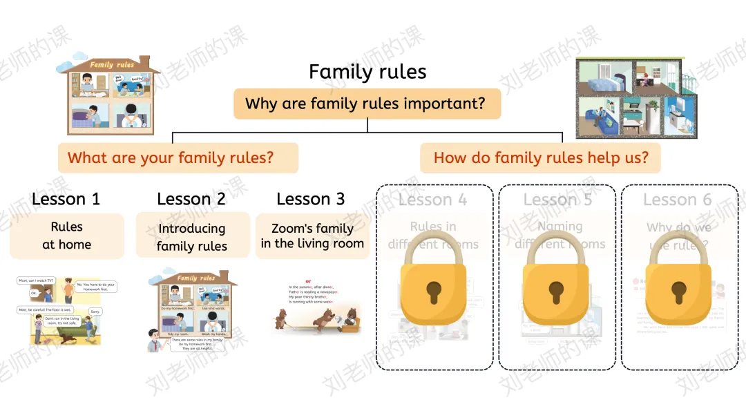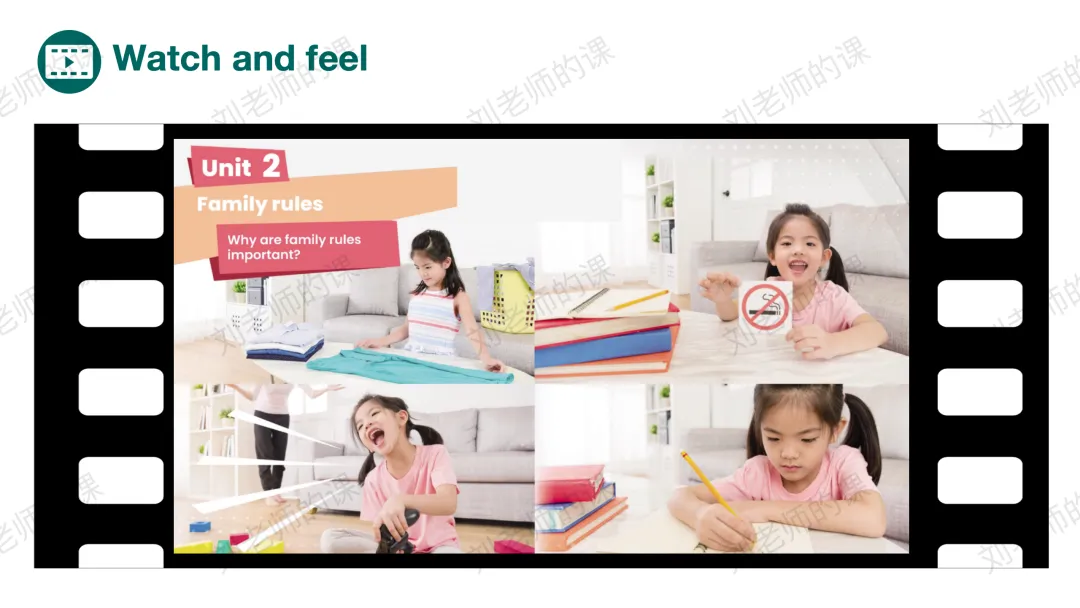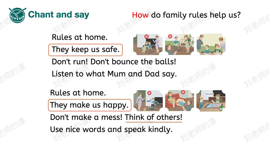 【感知与注意】在开篇页Listen and chant中谈论视频中出现的家规,教师引导学生感知了解。之后再听歌谣,找出家规如何帮助我们,回应单元主题。