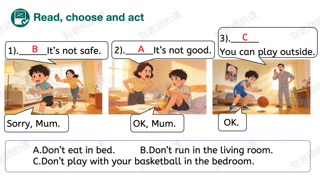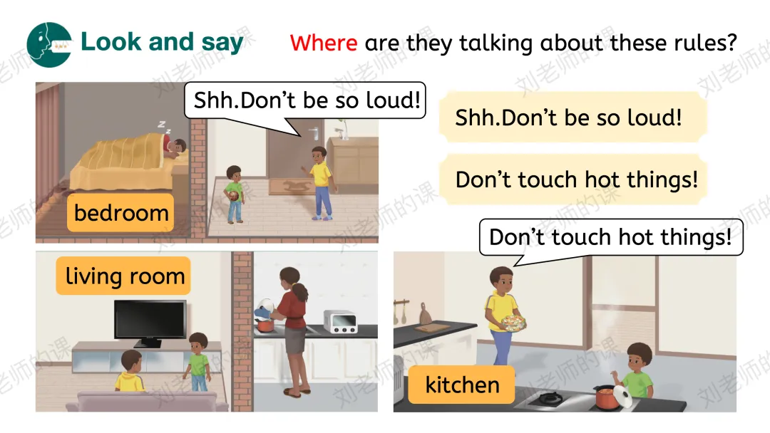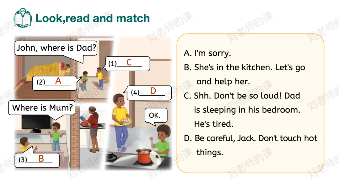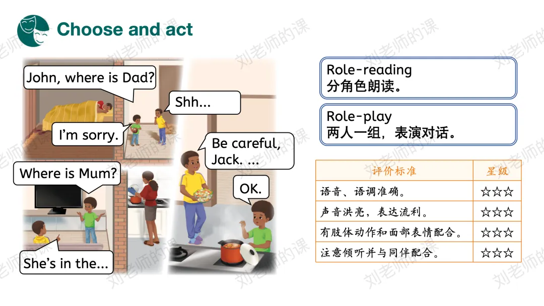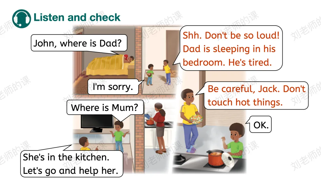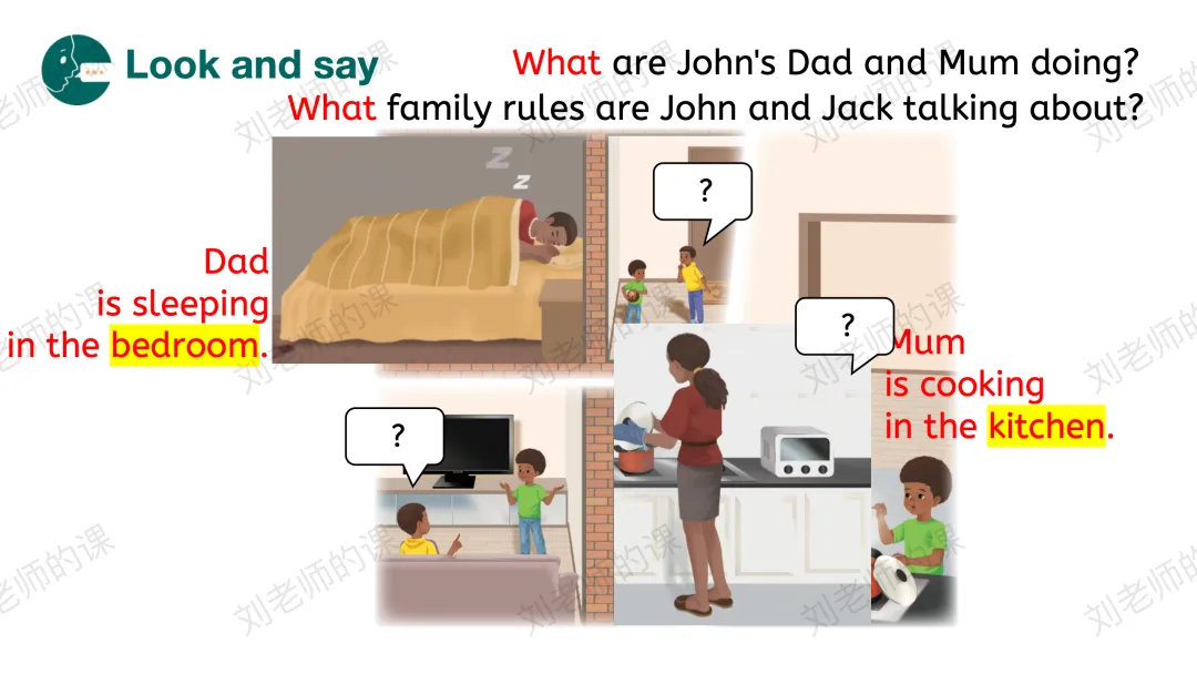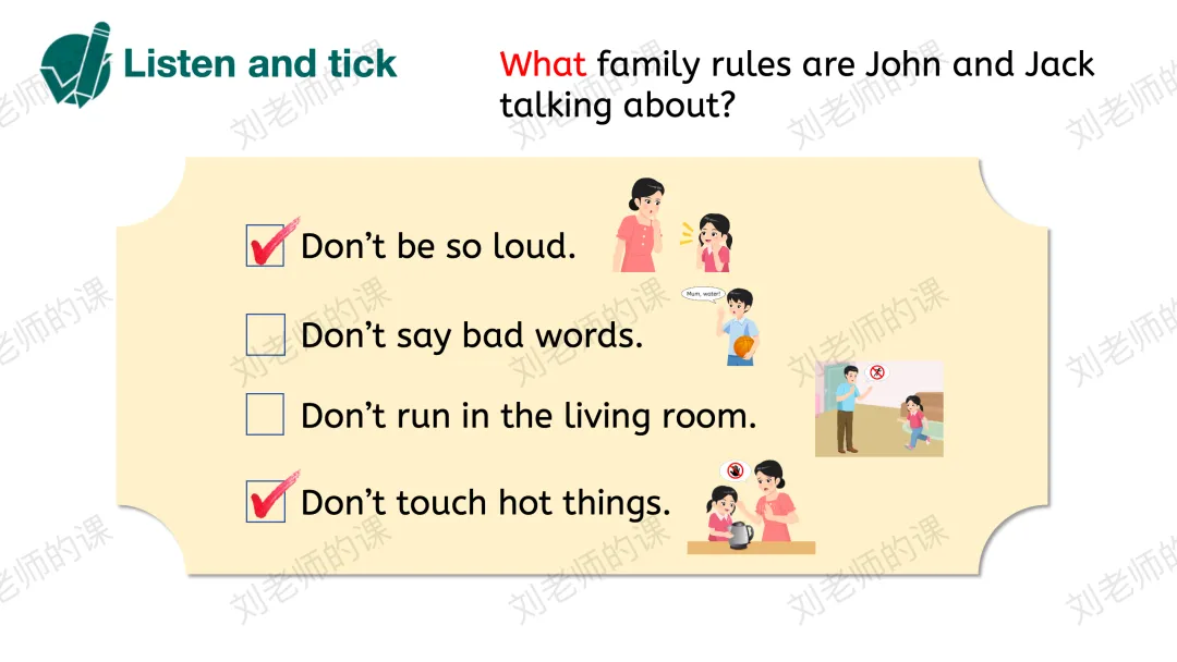 【获取与梳理】呈现课文图片,谈论图片中John的爸爸妈妈在哪里、在做什么事情,猜测John和Jack在谈论什么,并通过听音勾选出正确的答案。之后探究他们在哪里谈论、看视频了解Jack是否愿意遵守家规。