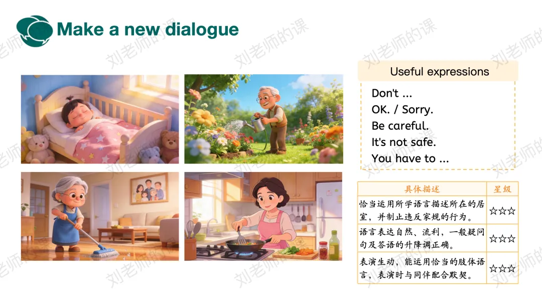 【描述与阐释】提供图片,引导学生从说单句、选择对话内容到自主创编对话。最后观看开篇页视频整体感知单元主题,升华情感。