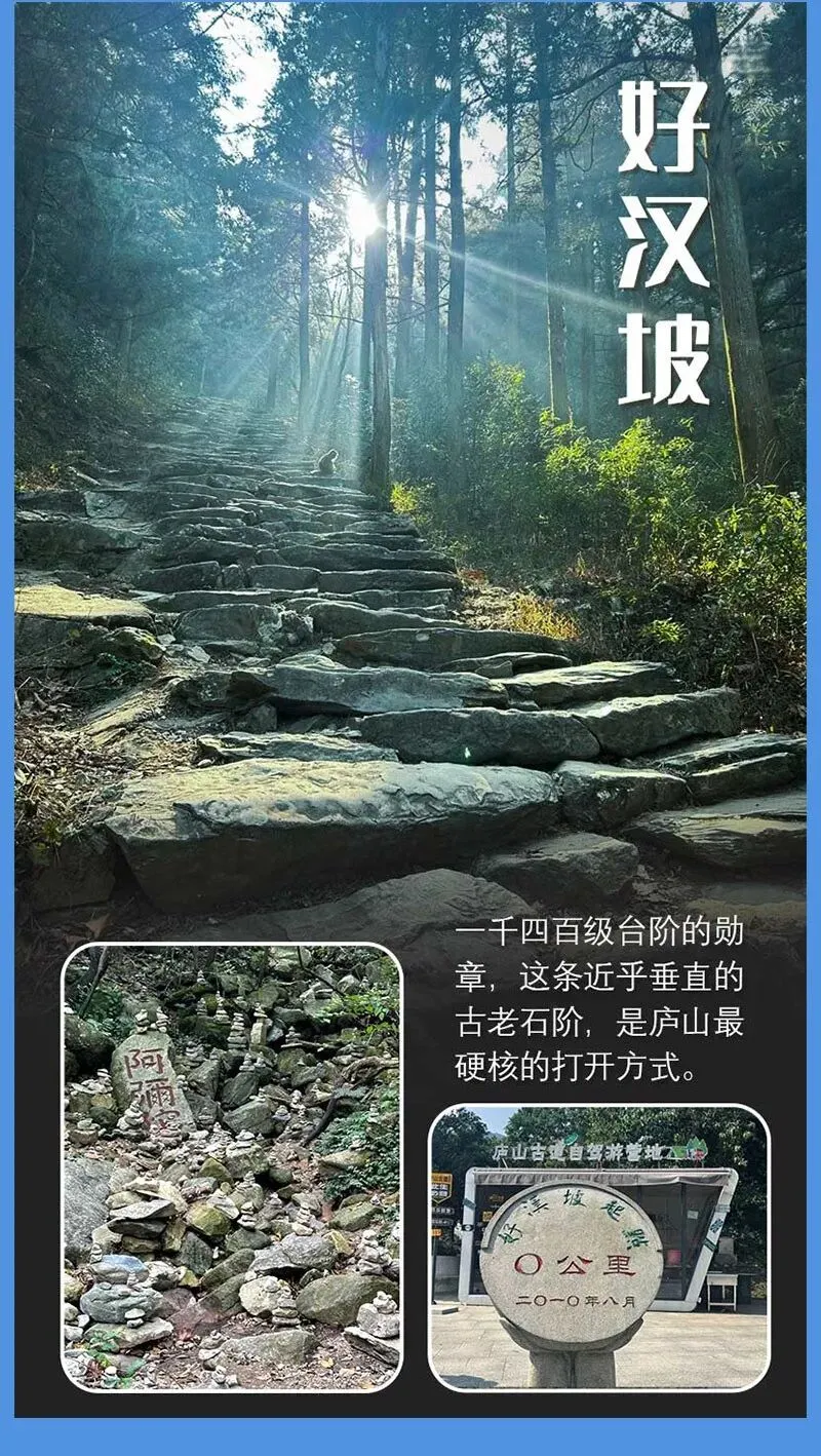 好汉坡是庐山著名的传统登山古道,有“不到好汉坡,枉来庐山游”之说。该地有千余级石阶,地势险峻,是庐山传统登山路线之一,近代周恩来、朱德、蒋介石、李四光等历史人物曾途经此处登山。沿途途经好汉亭、望江亭等地。