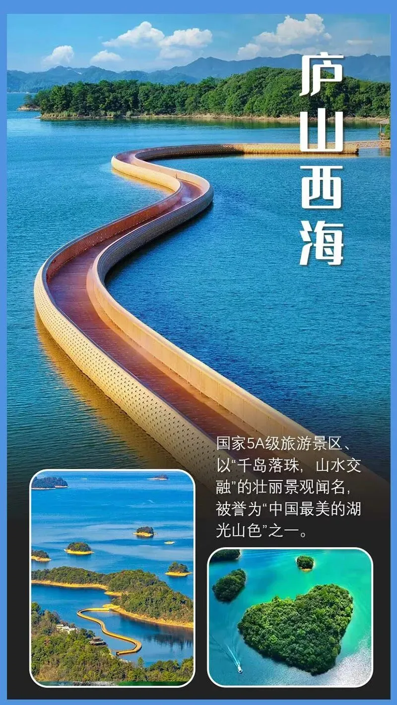 - 之后抵达庐山西海的云居岛码头,稍适休整开始徒步欣赏庐山西海七岛美景。全程徒步约8公里(云居岛-女神岛-箬溪岛-西海之星-明珠岛-沧海岛-桑田岛),时间充分的朋友还可以前往渔村群岛游览。