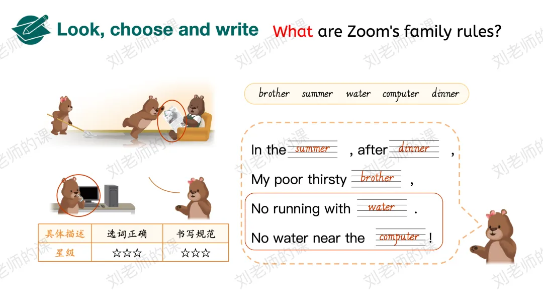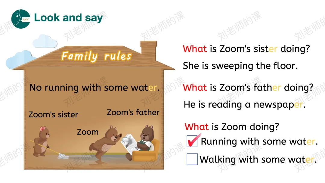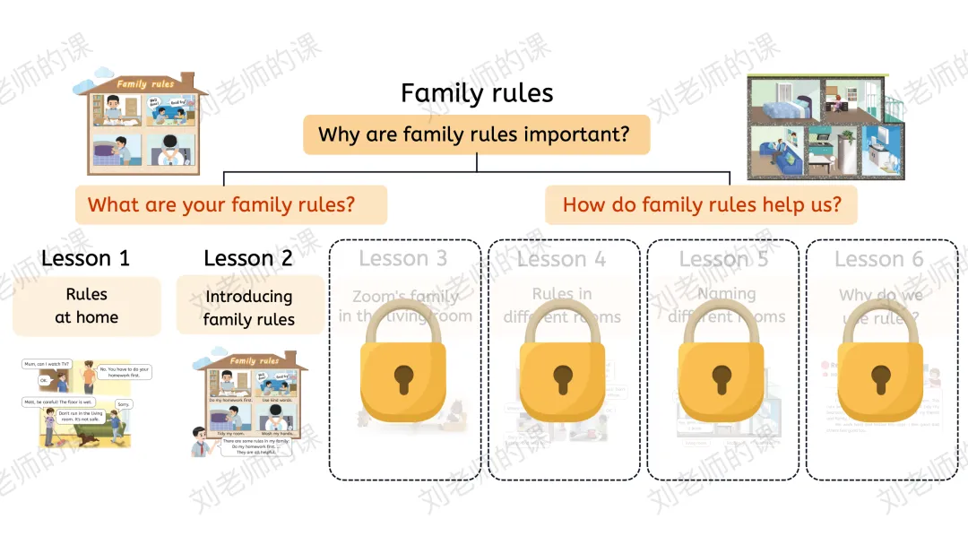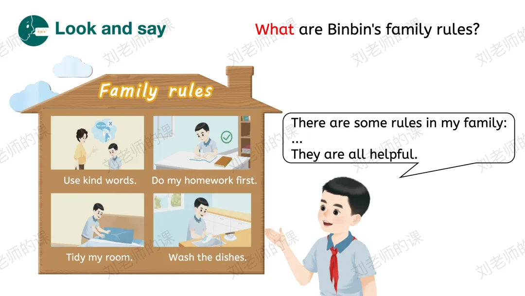 【感知与注意】在开篇页歌曲和看图汇报Binbin的家规引导学生探究主题。