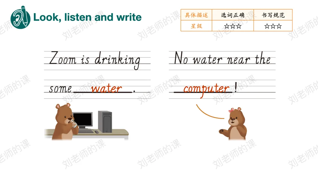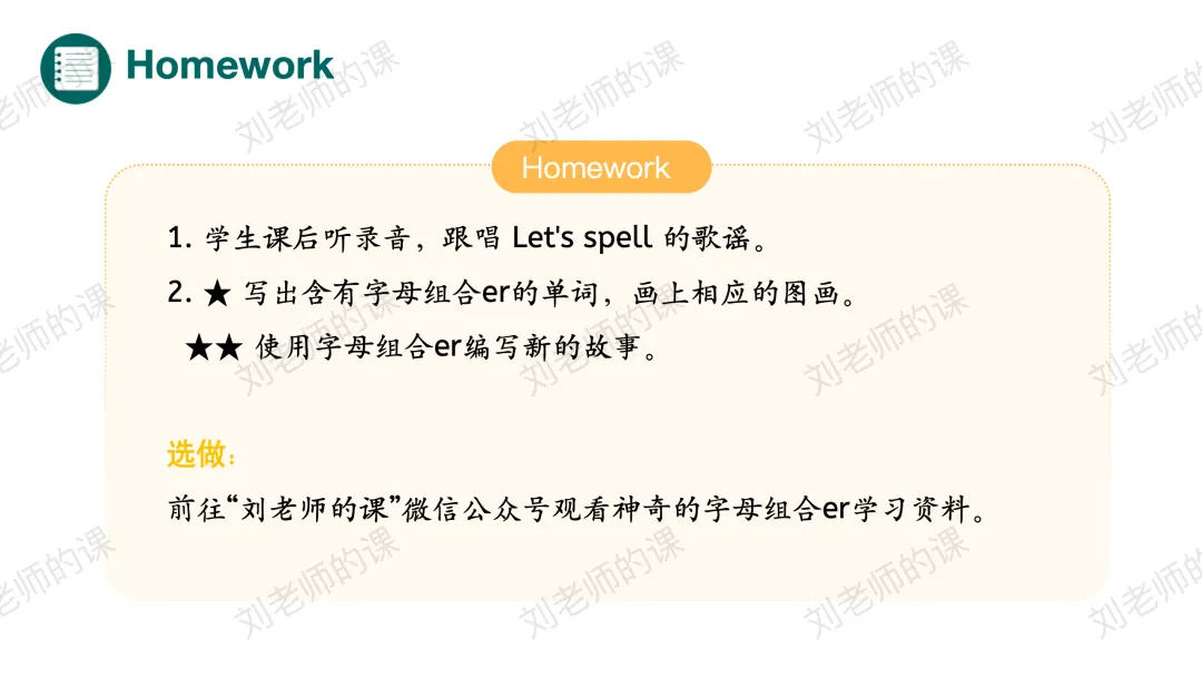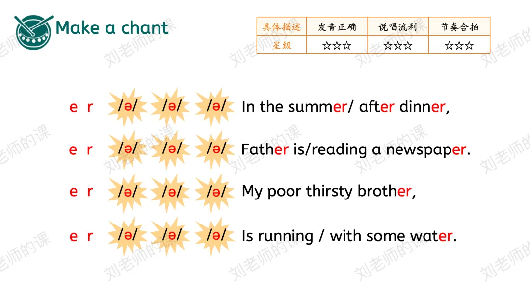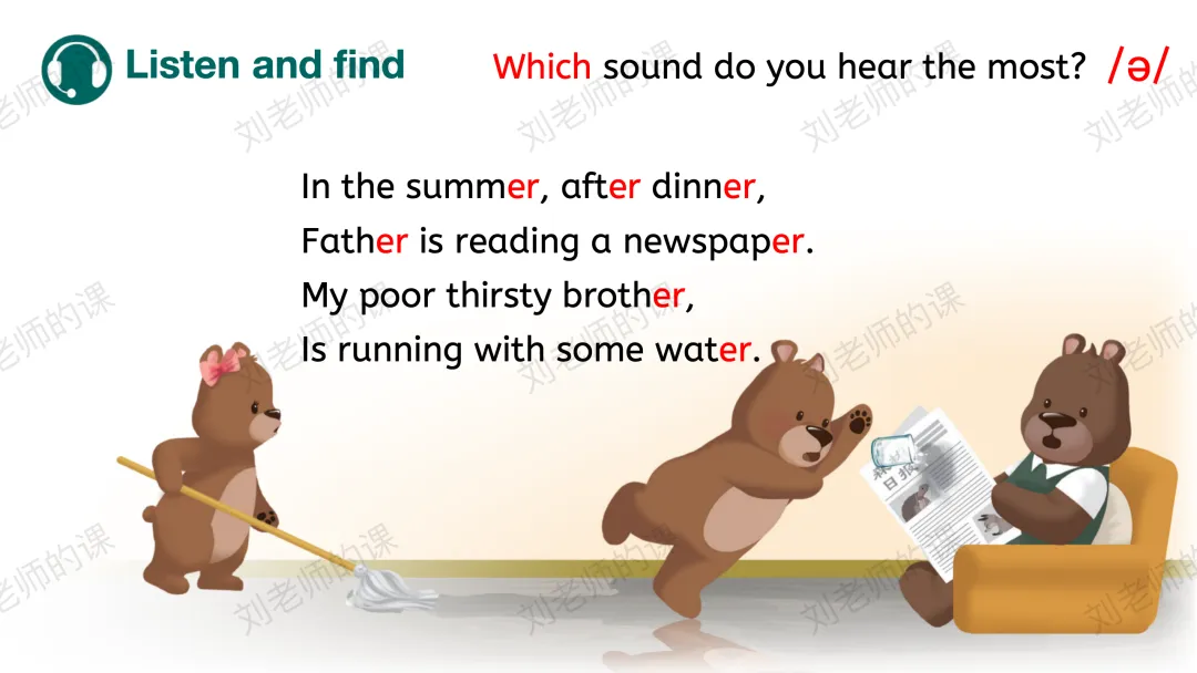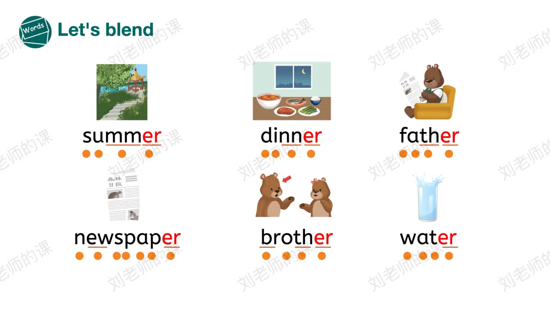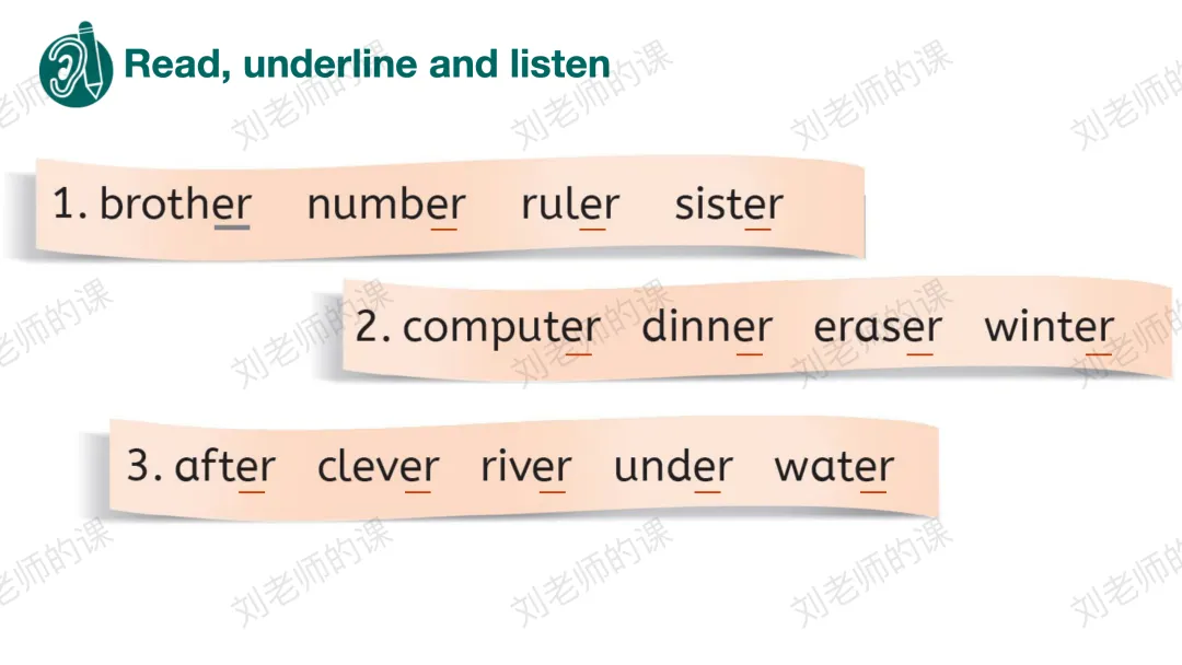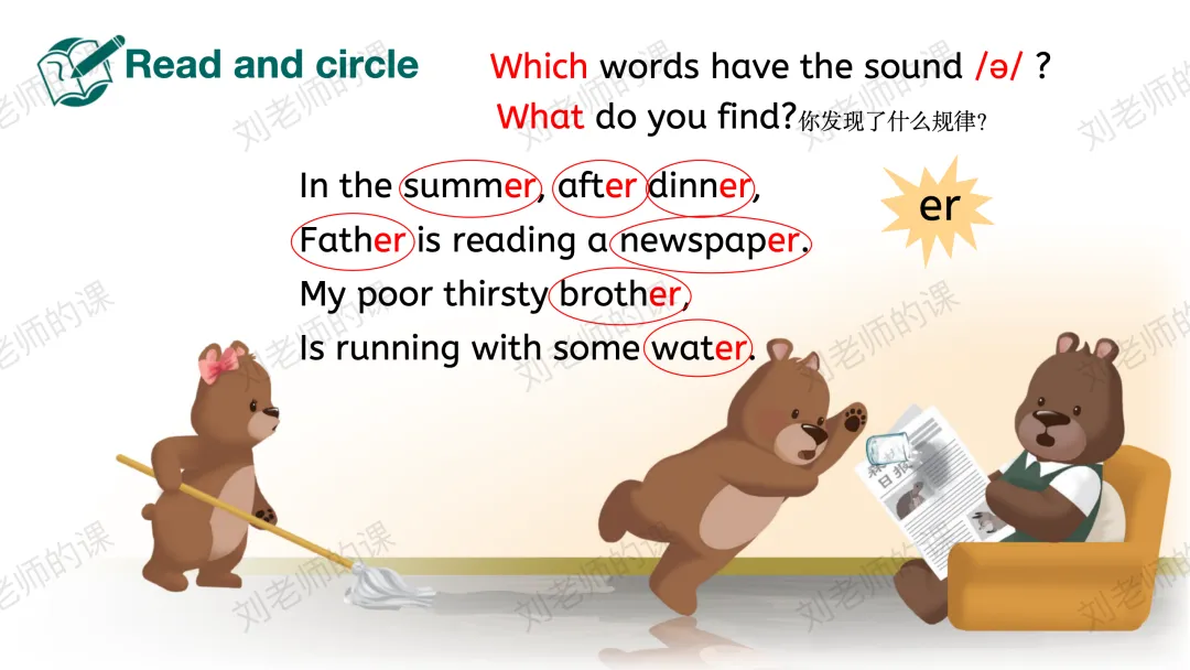 【获取与梳理】通过听音找出听到最多的发音、圈出发/ə/的单词并强化目标字母组合er的发音,之后通过拼读操练巩固目标词汇。