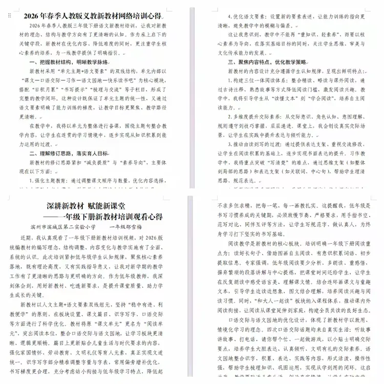 学而不思则罔,深入的学习激发了老师们的思考热情。培训结束后,教师们结合一年级语文教学的学段特点和学生认知规律,认真撰写培训感悟。字里行间,既有对专家理论的消化吸收,也有对自身教学实践的反思与规划,更承载着对新学期语文课堂的无限憧憬。大家纷纷表示,将把培训所学融入日常教学,让新教材的育人价值在一年级课堂中落地生根。