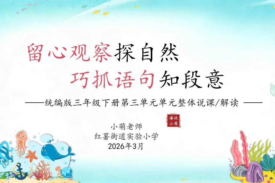 今天非常荣幸能和大家交流统编版三年级下册第三单元的单元整体教学解读与设计思路。本单元围绕 “留心观察探自然,巧抓语句知段意” 的核心展开,我将从研课标、析教材、依学情、巧设计、说教学、展特色六个方面,全面汇报本单元的教学规划与思考,也恳请各位老师多多批评指正。
