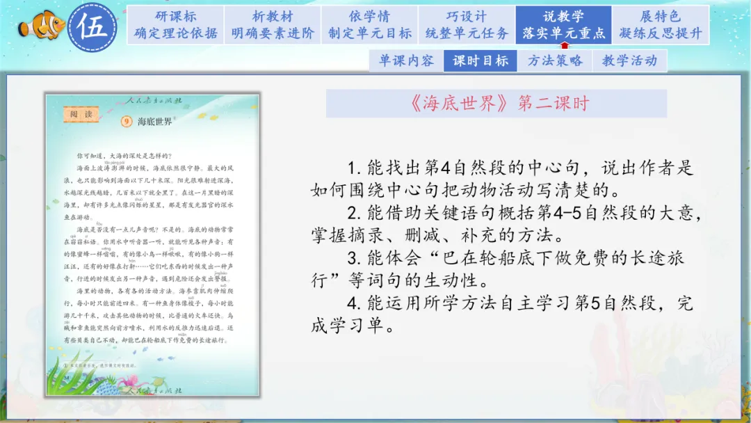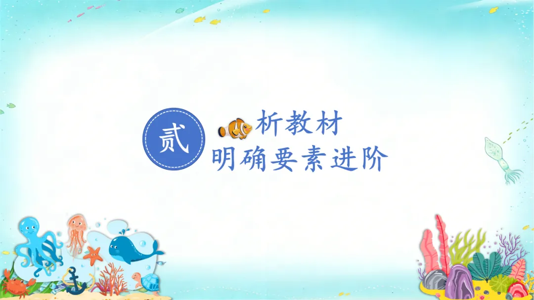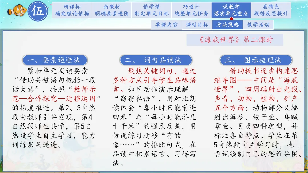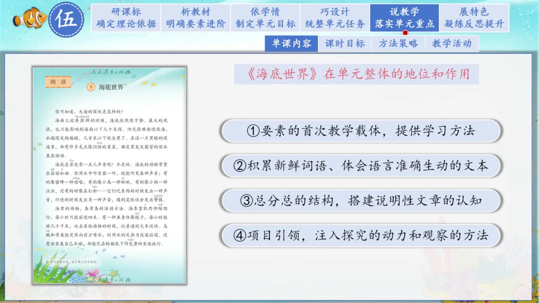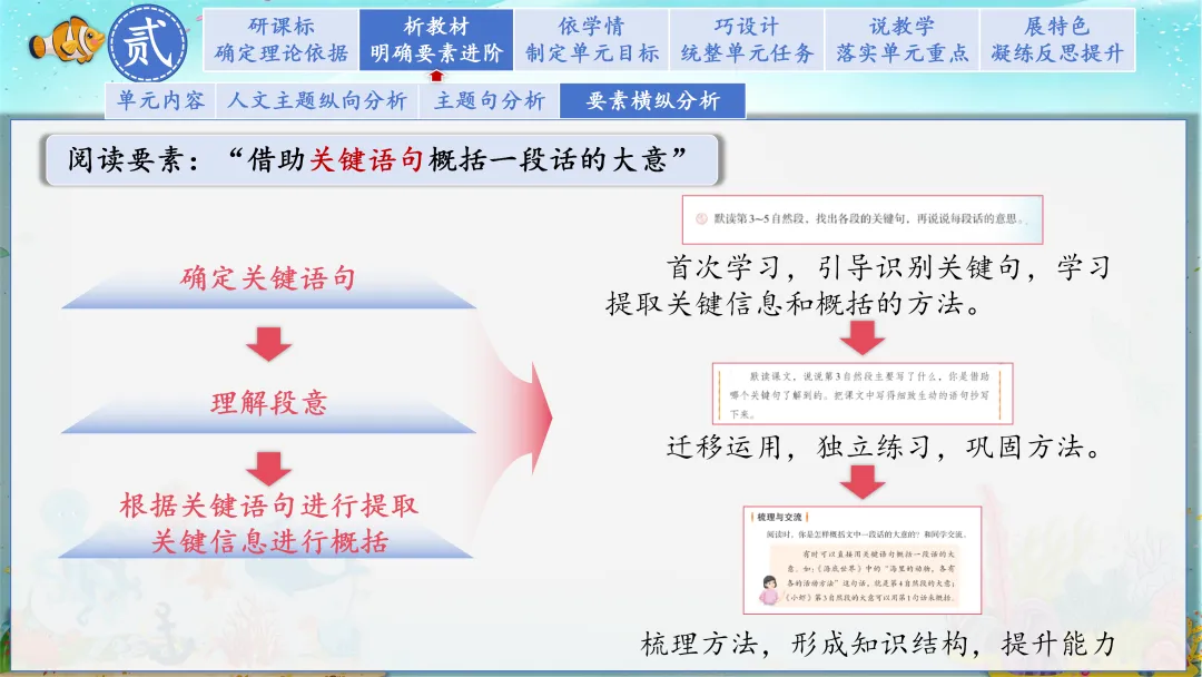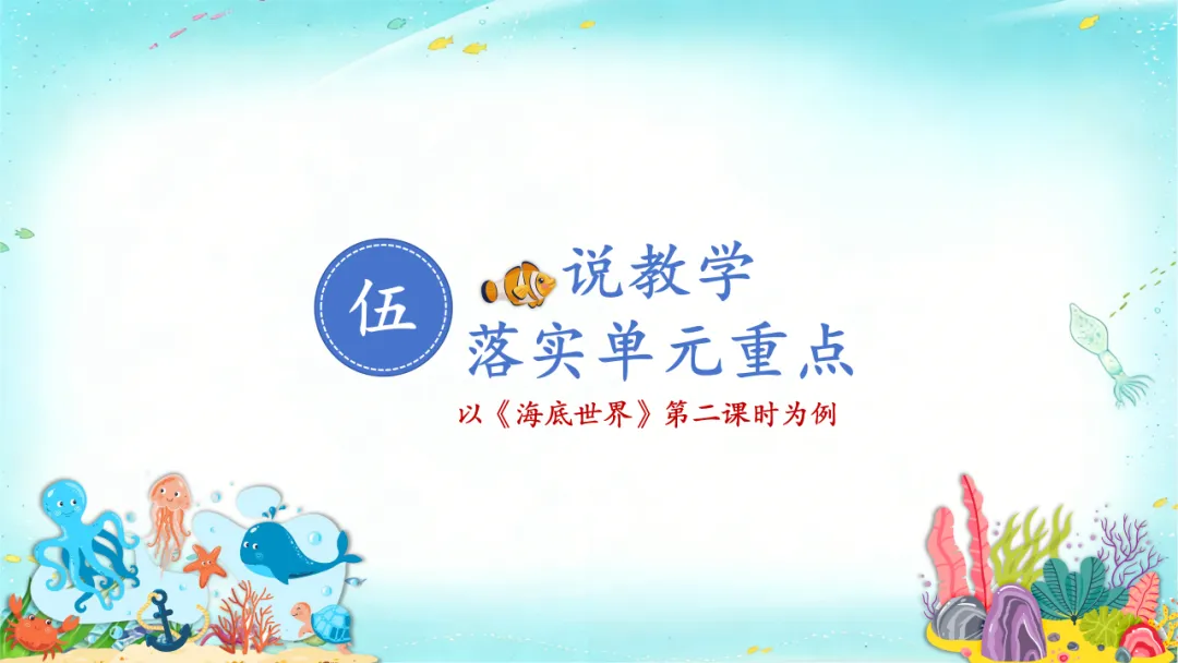 接下来,我将以《海底世界》第二课时为例,具体说说本单元阅读要素的落实方法。《海底世界》作为本单元阅读要素的首次教学载体,不仅是学生学习概括段意的范例,也是积累新鲜词语、体会说明性文章语言特点的文本,其总分总的结构能帮助学生搭建说明性文章的认知框架,同时也能为项目学习注入探究动力和观察方法,在单元教学中占据重要地位。