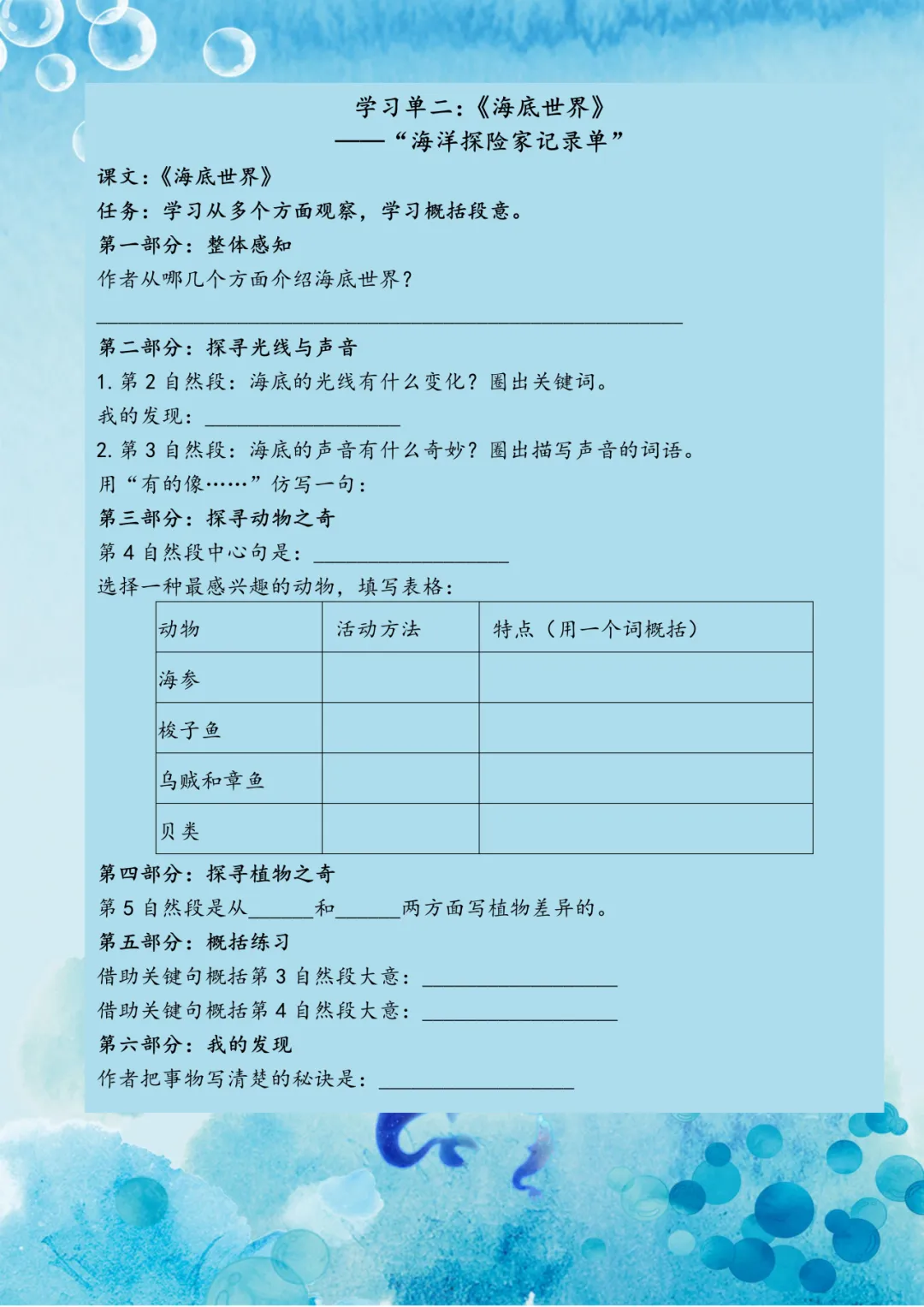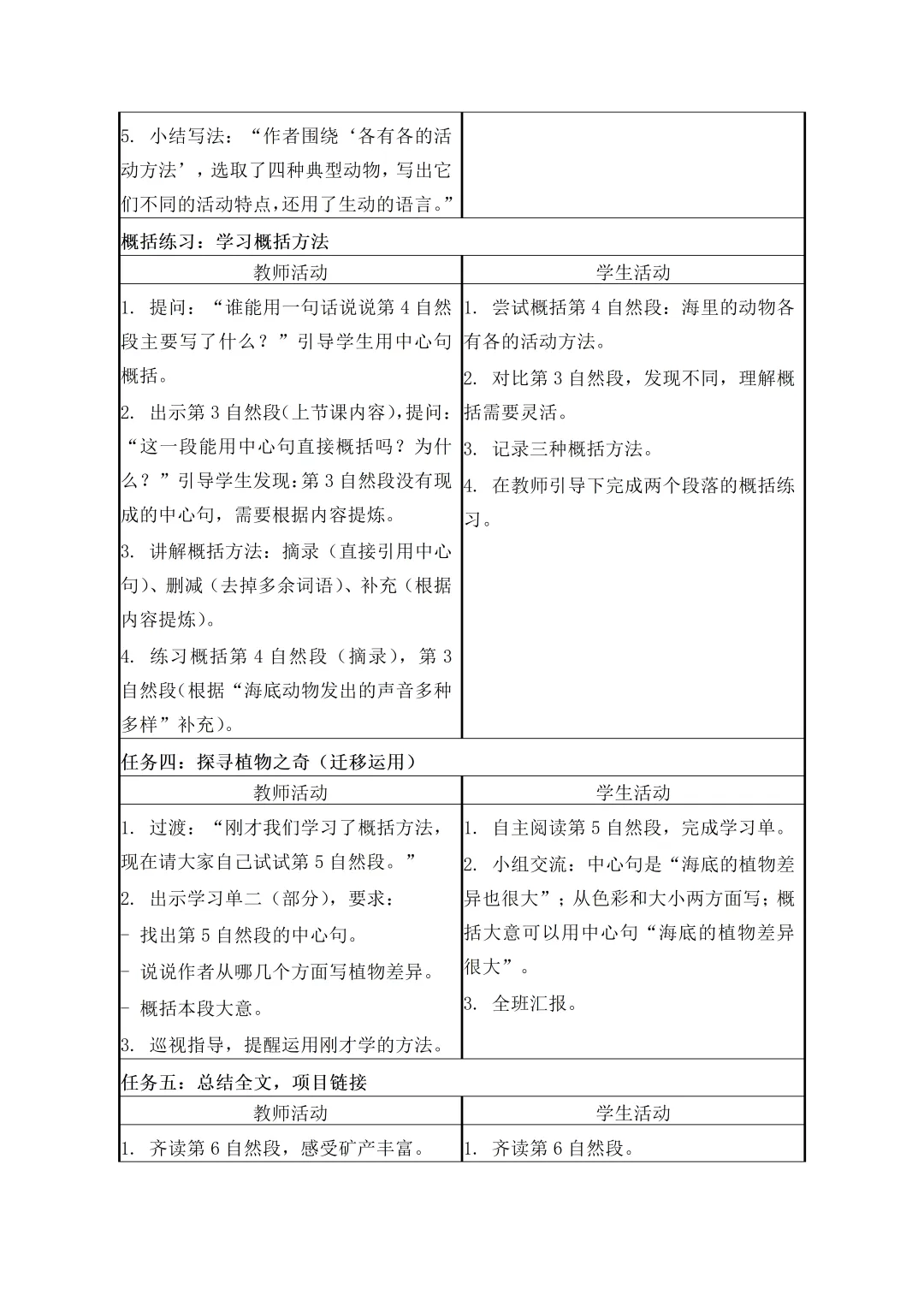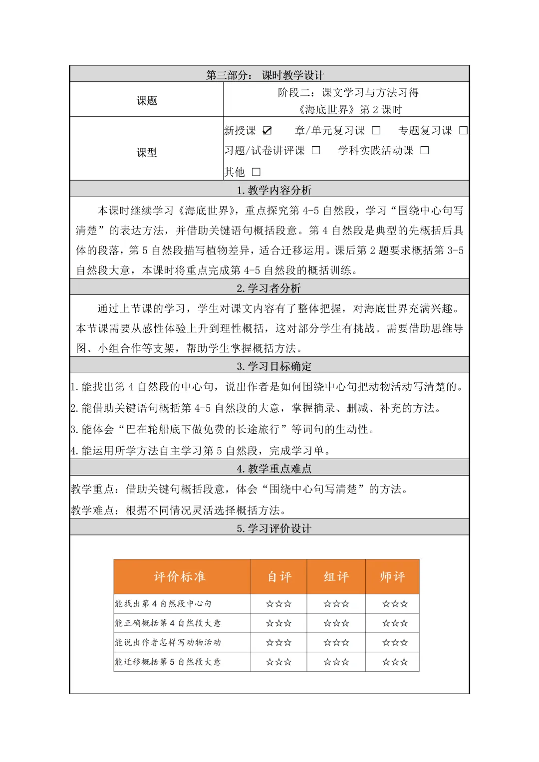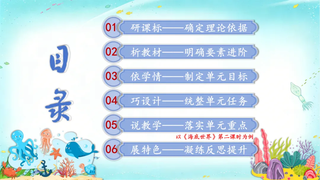 接下来,我将以《海底世界》第二课时为例,具体说说本单元阅读要素的落实方法。《海底世界》作为本单元阅读要素的首次教学载体,不仅是学生学习概括段意的范例,也是积累新鲜词语、体会说明性文章语言特点的文本,其总分总的结构能帮助学生搭建说明性文章的认知框架,同时也能为项目学习注入探究动力和观察方法,在单元教学中占据重要地位。