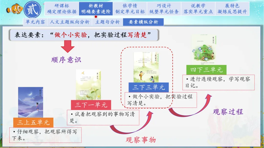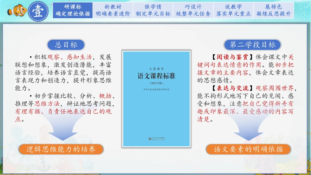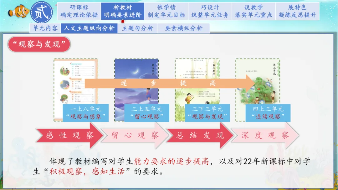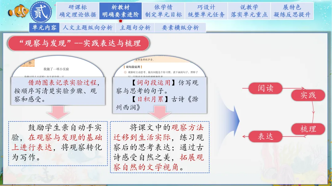 语文课程标准是我们教学的根本遵循,本单元的教学设计紧扣课标总目标与第二学段目标展开。课标总目标提出,要引导学生积极观察、感知生活,发展形象思维,初步掌握概括、推理等思维方法,负责任地表达观点。而第二学段在阅读与鉴赏方面,要求学生体会关键词句的表达作用,初步把握文章主要内容;表达与交流方面,则强调观察周围世界,把新奇有趣、印象深刻的内容写清楚,这为本单元 “观察与发现” 的核心主题奠定了理论基础。