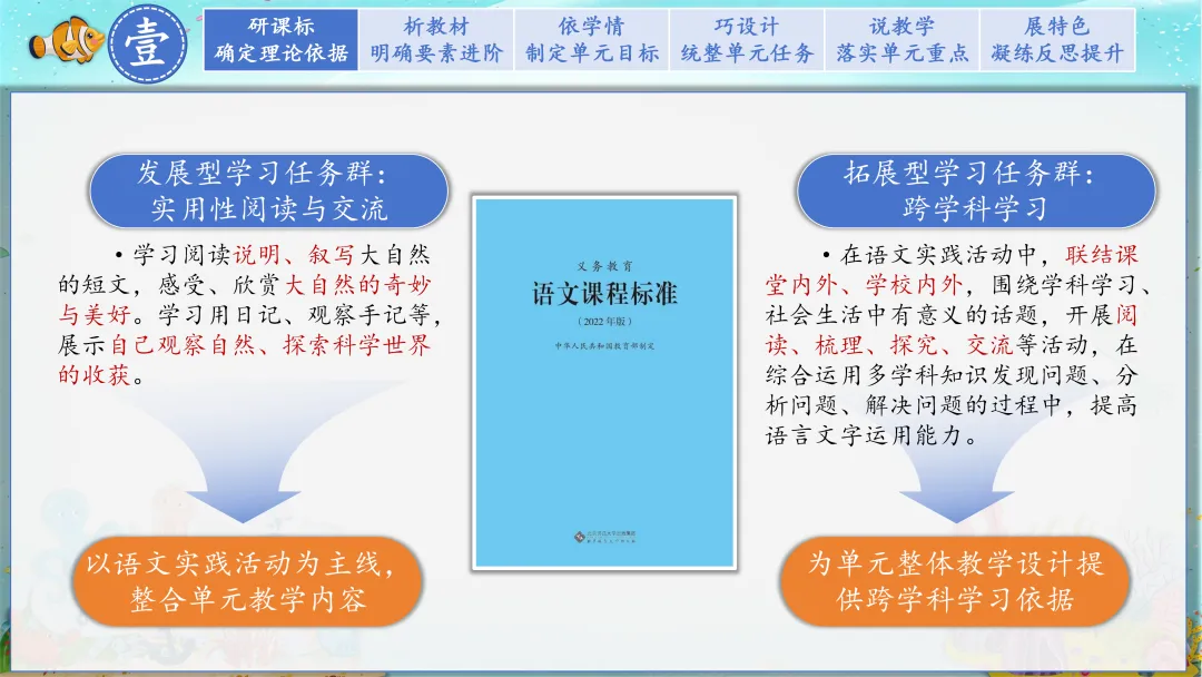 同时,本单元的学习也依托课标中的两大学习任务群。一是发展型学习任务群中的实用性阅读与交流,要求学生学习阅读叙写大自然的短文,感受自然的奇妙,并用日记、观察手记等形式展示观察收获;二是拓展型学习任务群中的跨学科学习,倡导联结课堂内外,综合运用多学科知识发现和解决问题,提升语言文字运用能力。这两大任务群为我们开展单元整体教学、设计跨学科活动提供了明确依据,也让我们确定了以语文实践活动为主线,整合单元教学内容的整体思路。