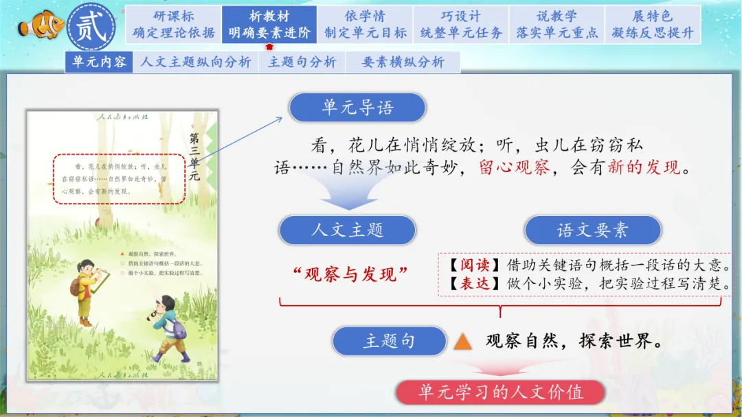 单元的人文主题是 “观察与发现”,通时本单元的两大核心语文要素:阅读上,借助关键语句概括一段话的大意;表达上,做个小实验,把实验过程写清楚。人文主题和要素共同指向了本单元的主题句:“观察自然,探索世界”,这也是单元学习的人文价值。
