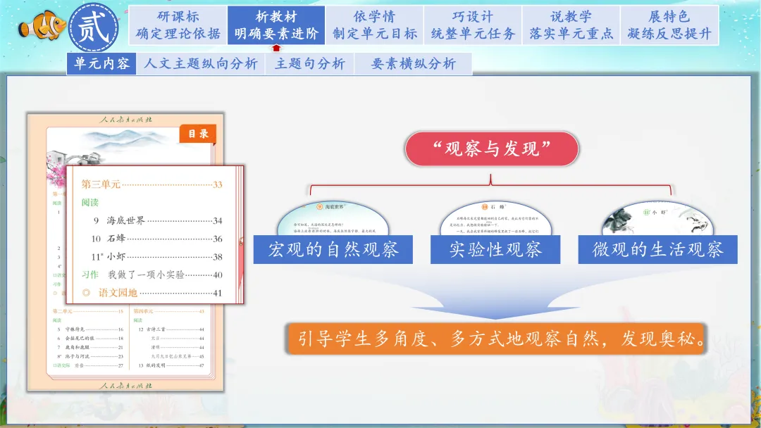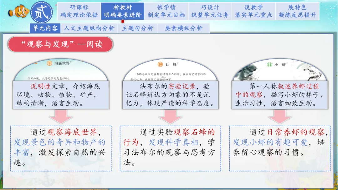 本单元三篇课文从不同维度诠释“观察与发现”:《海底世界》是宏观的自然观察,《石蜂》是实验性观察,《小虾》是微观的生活观察。它们共同引导学生多角度、多方式地观察自然,发现奥秘。