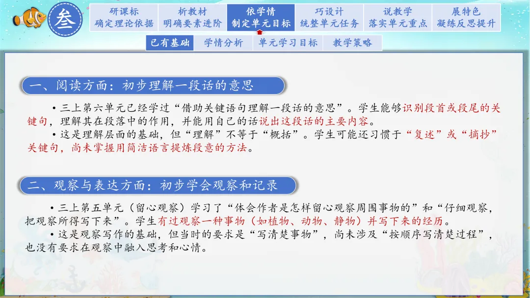 要做好教学设计,必须精准把握学生的已有基础和学习难点,首先来看学生的已有基础:阅读上,三上第六单元学生已学过借助关键语句理解段意,能识别段首、段尾的关键句,用自己的话复述主要内容,但 “理解” 不等于 “概括”,学生还未掌握简洁提炼段意的方法;观察与表达上,三上五单元学生有过观察静态事物并写作的经历,但尚未涉及按顺序写清楚动态过程,也不会在观察中融入思考;科学探究方面,学生对自然充满好奇,接触过简单科学实验,有初步的探究欲望;生活经验上,学生有过零散的自然观察经历,为单元学习提供了感性基础。