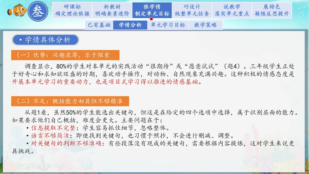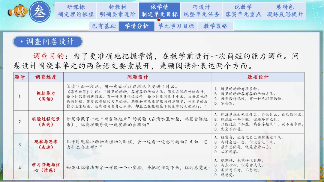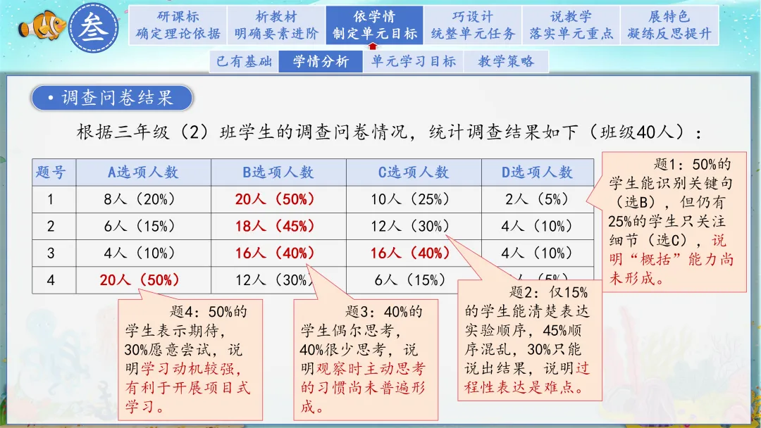 为我在教学前对本班 40 名学生进行了针对性的学情调查,围绕本单元的阅读和表达要素设计了四道调查问卷,结合调查结果和三年级学生的认知特点,做了全面的学情分析。