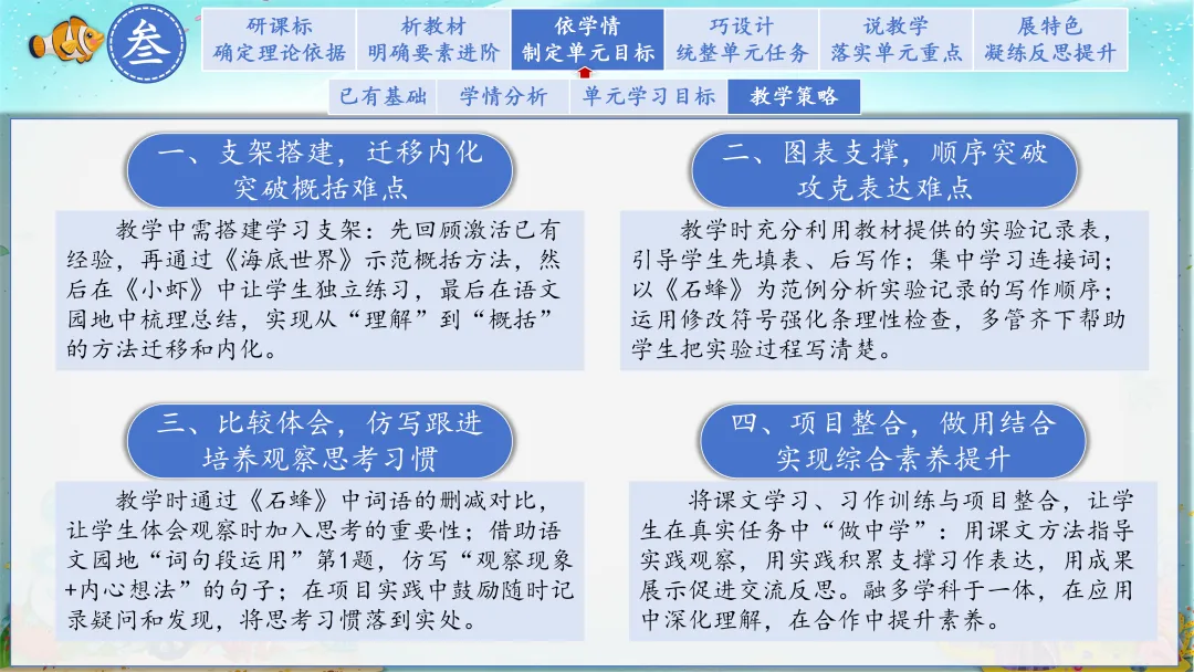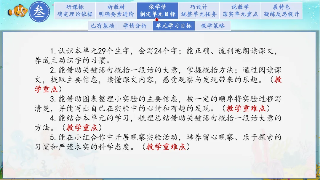 基于这样的学情,我制定了本单元的五大学习目标:1. 认识 29 个生字,会写 24 个字,正确流利朗读课文,养成主动识字习惯;2. 能借助关键语句概括段意,掌握概括方法,读懂课文内容,感受观察与发现的乐趣,这是教学重点;3. 能借助图表整理实验信息,按顺序写清楚实验过程,写出实验中的心情和发现,这是教学重难点;4. 能梳理总结概括段意的方法,也是教学重点;5. 在小组合作中开展观察实验,培养留心观察、乐于探索的习惯和严谨的科学态度,这也是教学重难点。