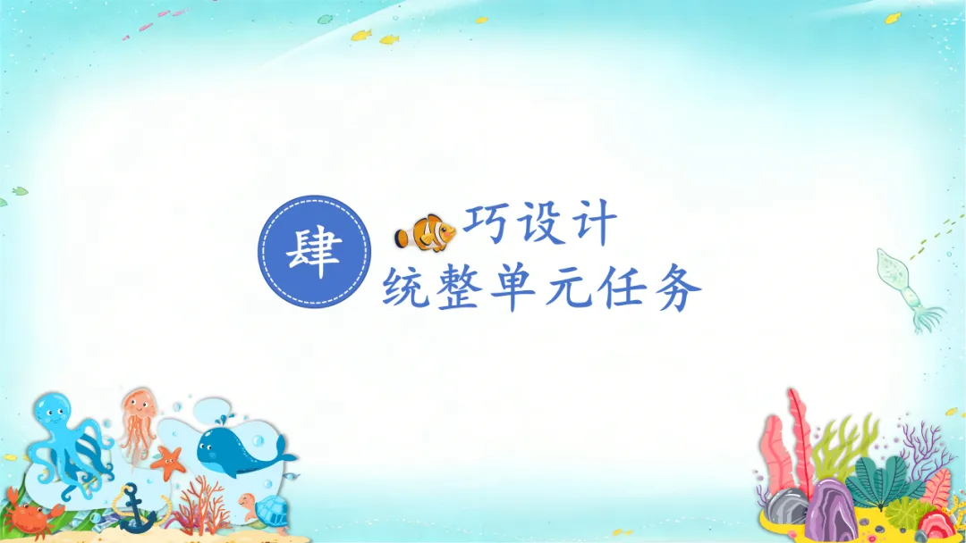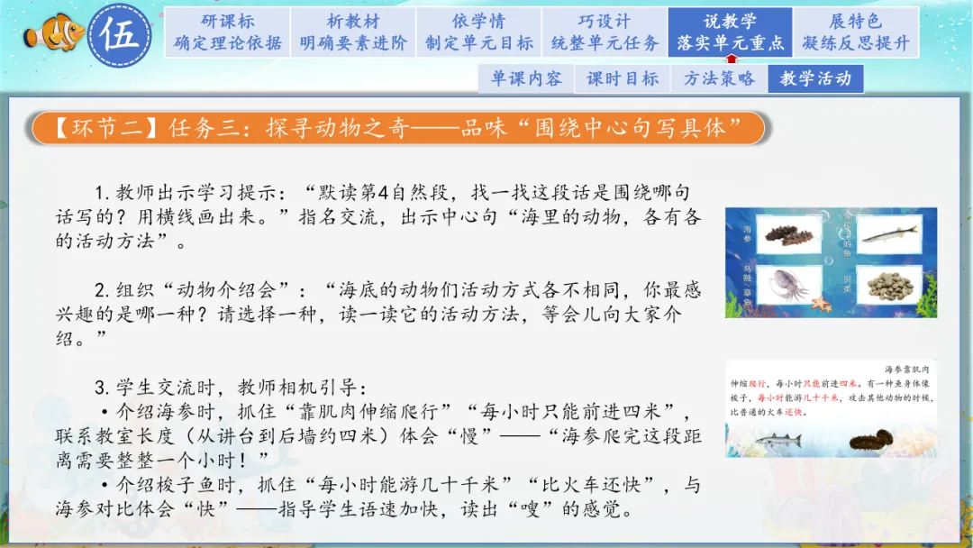 第二个环节,探寻动物之奇,品味 “围绕中心句写具体”。首先让学生默读第 4 自然段,找出中心句 “海里的动物,各有各的活动方法”;随后开展 “动物介绍会”,让学生选择感兴趣的动物,介绍其活动方法;在学生交流时,教师相机引导,通过联系实际体会海参的 “慢”、对比朗读体会梭子鱼的 “快”、播放视频理解乌贼和章鱼的 “智”、表演品读体会贝类的 “趣”,让学生深入理解文本;最后小结写法,让学生明确作者围绕中心句,选取典型事物,用生动语言写具体的表达方法,并通过师生合作朗读,巩固对段落的理解。