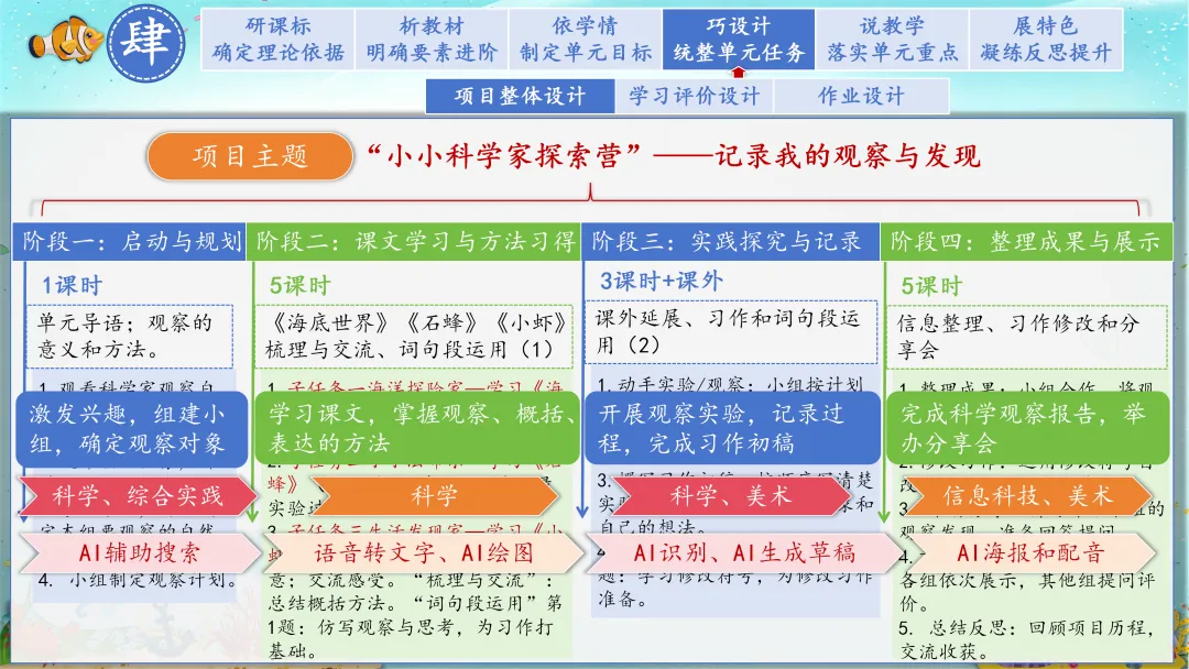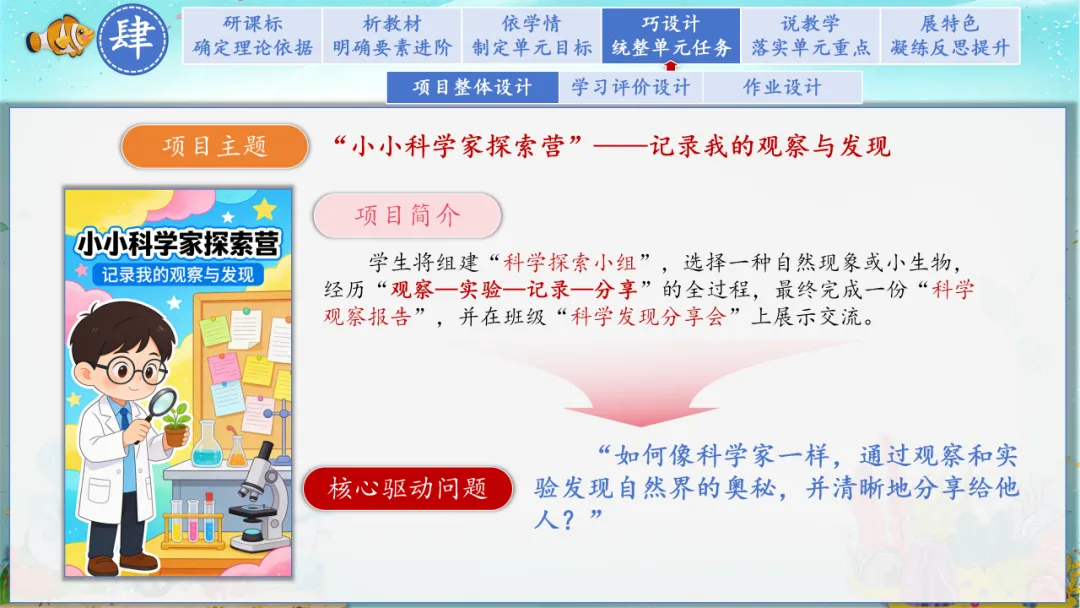 基于课标要求、教材分析和学情特点,我将本单元设计为 “小小科学家探索营 —— 记录我的观察与发现” 项目式学习,以 “如何像科学家一样,通过观察和实验发现自然界的奥秘,并清晰地分享给他人?” 为核心驱动问题,整合单元所有教学内容,将学习过程分为四个阶段,共计 14 课时,同时设计了多元的学习评价和分层的作业体系。