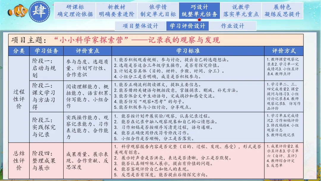 为了保障项目学习的效果,我设计了过程性评价与总结性评价相结合的多元评价体系。过程性评价覆盖前三个阶段,分别从参与态度、选题质量、概括能力、表达能力、实践操作能力等方面设置评价重点和学习标准,采用教师观察、学习单检查、小组互评等方式进行;总结性评价聚焦成果展示阶段,从观察报告质量、展示表现、合作贡献、反思深度等方面评价,通过成果评价量表、展示互评表、自评互评单等工具,全面反映学生的知识、能力和情感态度发展。