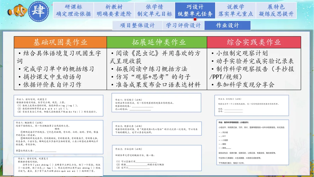 作业设计则分为基础巩固类、拓展延伸类和综合实践类三层,分层设计满足不同学生的学习需求。基础巩固类作业聚焦生字词、概括练习、语句摘抄等,夯实语文基础;拓展延伸类作业包括阅读《昆虫记》、拓展概括练习、仿写句子等,提升学生的语言积累和运用能力;综合实践类作业则围绕项目学习展开,包括制定观察计划、完成实验记录、制作观察报告、参加分享会等,实现学用合一。