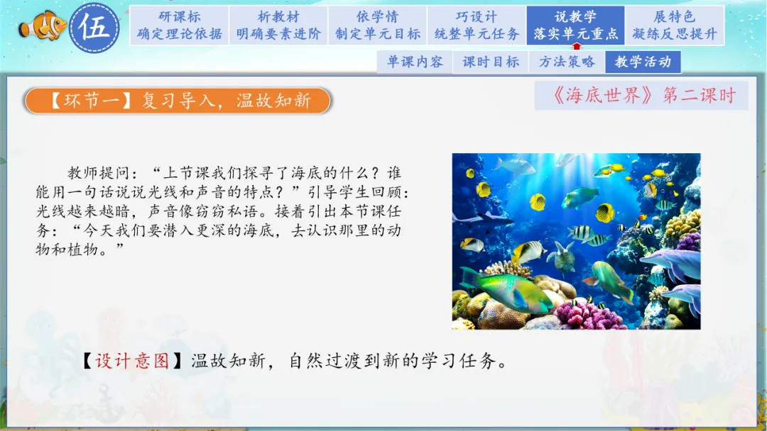 第一个环节,复习导入,温故知新。通过提问 “上节课探寻了海底的什么?用一句话说说光线和声音的特点”,引导学生回顾上节课内容,自然引出本节课 “认识海底的动物和植物” 的学习任务,实现知识的衔接。