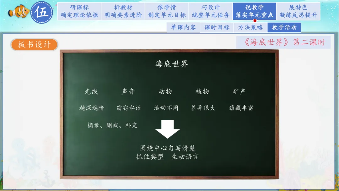 本节课的板书设计力求简洁明了、重点突出,上侧梳理课文从光线、声音、动物、植物、矿产五个方面介绍海底世界,标注各方面的核心特点;下侧点明本文的表达方法和本单元的阅读方法,让学生一目了然,形成清晰的知识框架。
