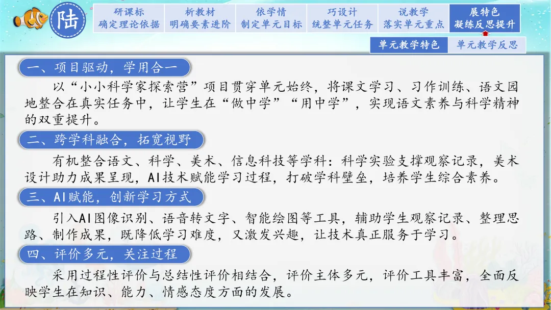 一是项目驱动,学用合一。以 “小小科学家探索营” 项目贯穿始终,将课文学习、习作训练、语文园地整合在真实的探究任务中,让学生在 “做中学”“用中学”,既落实了语文要素,又培养了科学精神,实现了语文素养与综合能力的双重提升。