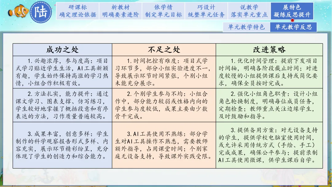 四是评价多元,关注过程。采用过程性评价与总结性评价相结合,评价主体涵盖教师、学生小组、学生自己,评价工具包括学习单、评价量表、互评表等,全面、客观地反映学生的学习过程和发展情况,真正发挥评价的导向和激励作用。