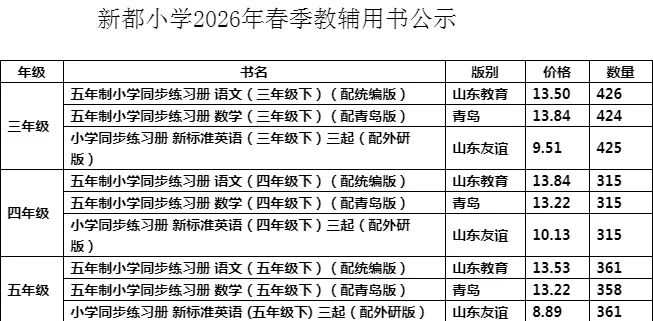 为进一步规范教辅材料的使用管理,减轻学生过重的课业负担,保障教学质量,满足孩子们的学习需求,根据山东省教育厅《关于做好2020年中小学教辅材料推荐选用工作的通知》(鲁教基函〔2020〕24号)和威海市教育局《威海市教育局关于做好2020年中小学教辅材料征订工作的通知》(威教基字〔2020〕16 号)等相关文件要求,威海市教育局组织完成了中小学教辅材料推荐选用工作,确定了我市中小学教辅材料推荐选用目录。现将2026年春季教辅材料征订情况予以公示。