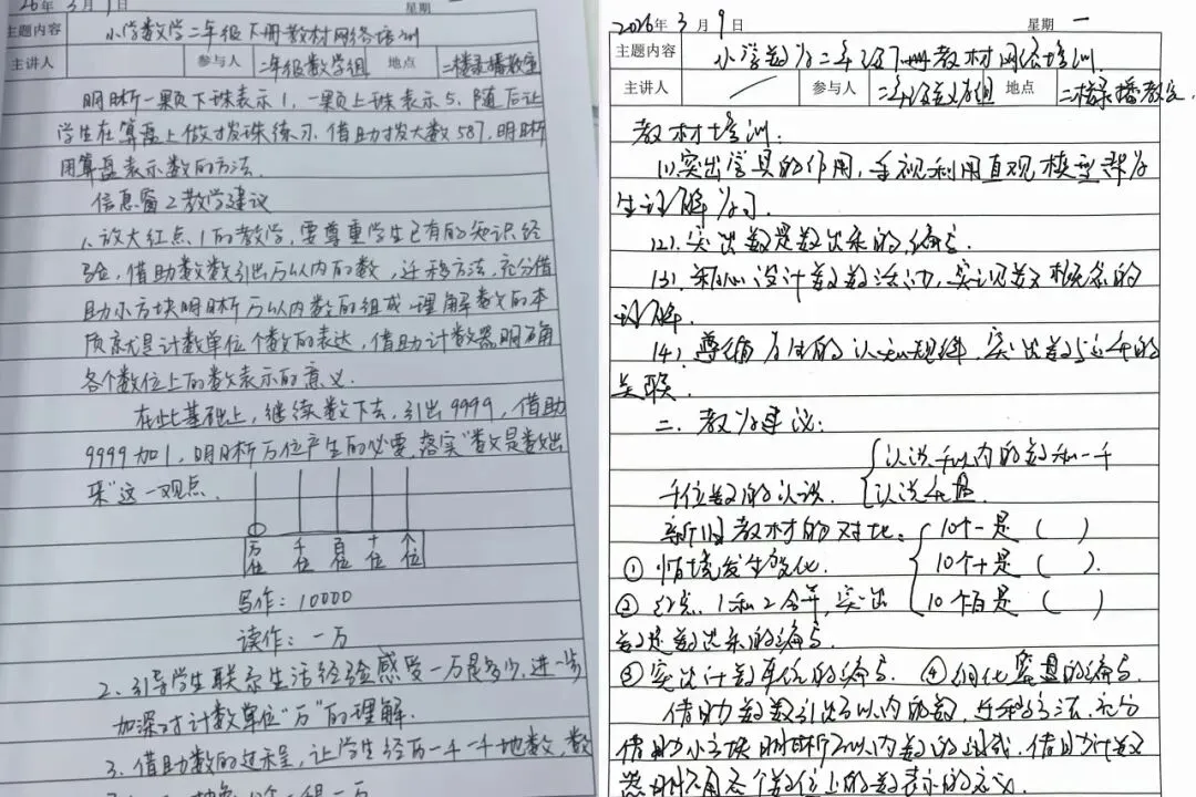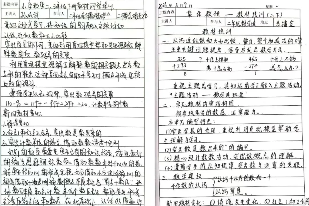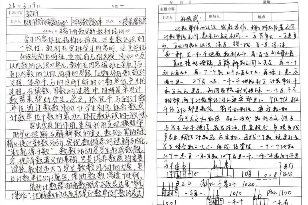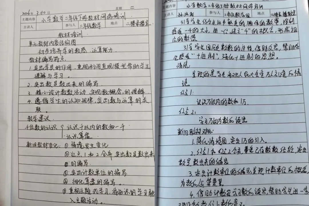 此次培训干货满满,老师们认真聆听,积极讨论,手中的笔不停记录。从算理启蒙到思维过渡,大家将专家分享的教材解读要点、教学策略和易错点一一详记。笔记上重点标注清晰,既有对新课标的理解,也有对课堂实践的反思。老师们纷纷表示,将带着这些“干货”融入日常教学,助力学生核心素养落地。