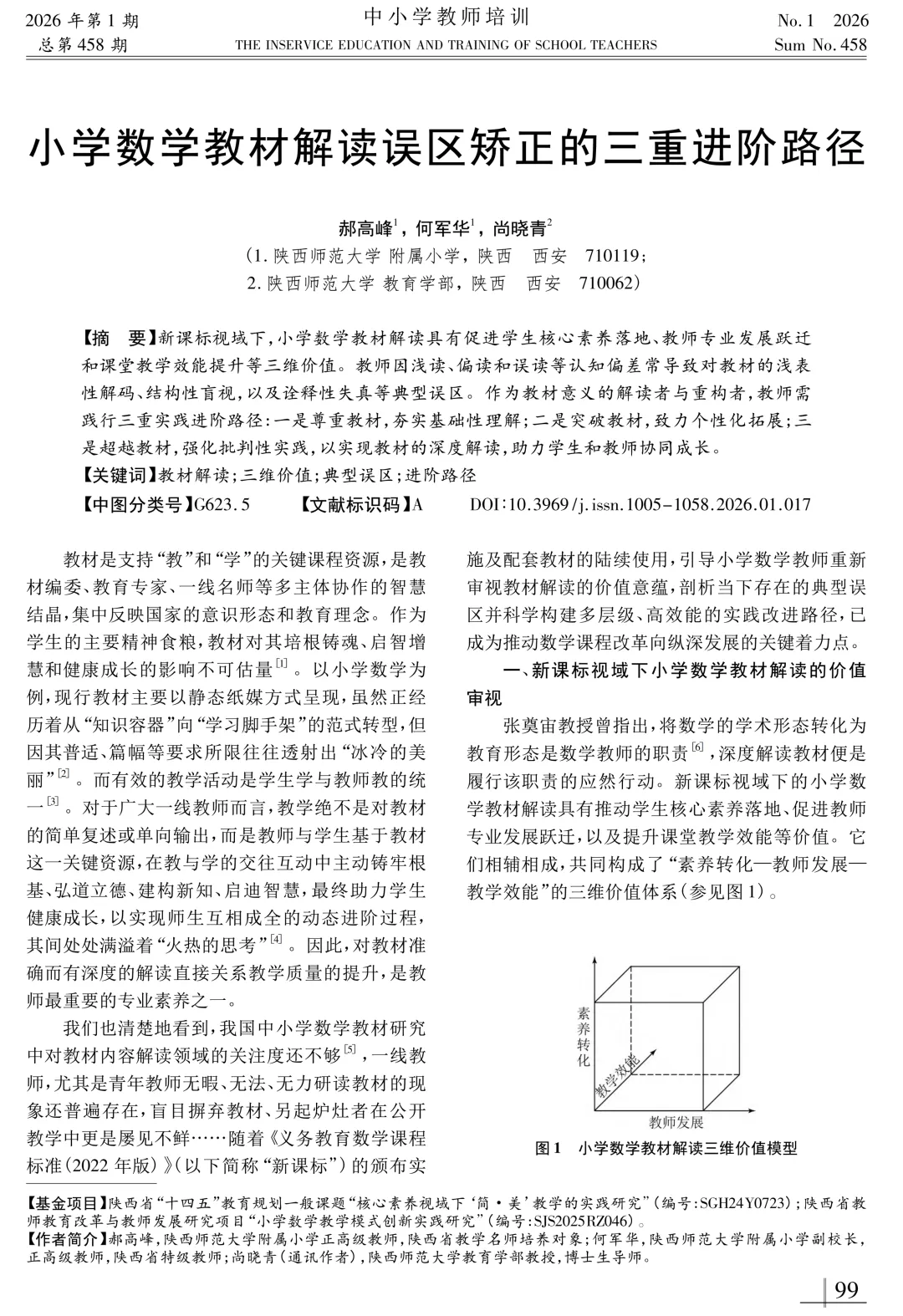 【引用格式】郝高峰,何军华,尚晓青.小学数学教材解读误区矫正的三重进阶路径[J].中小学教师培训,2026,(01):99-104.本文系郝高峰、何军华老师在尚晓青教授的指导下合作完成,发表在2026年第1期的《中小学教师培训》杂志上。我们以为,教材解读问题在任何时候强调应该都不为过。本文就是我们结合日常教学和学习所进行的一些浅显思考和实践,感恩老师们的批评指正!刊发过程中得到了编辑老师的鼓励和多次专业指导,在此一并表示感谢,也特别感谢《中小学教师培训》杂志的抬举和厚爱!