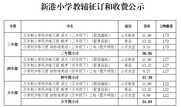 新港小学2026年春季教辅材料征订公示