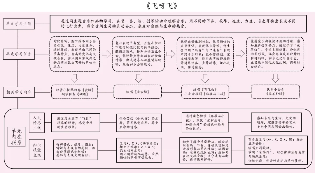 音乐以其独特的艺术语言描绘自然界的生命气息与山河之美。本单元以“飞呀飞”为主题,选取《蜜蜂》《蝴蝶》《飞飞曲》《采茶扑蝶》等作品,引导学生在聆听、演唱、律动、编创等艺术实践活动中,感受音乐所塑造的“飞行意象”,建立音乐与自然的联结,培育热爱自然、珍爱生命的美好情感。