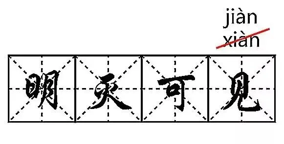 有的老师根据教材注释中的译文“时隐时现”,认为应读xiàn,这是不正确的。“明灭可见”和“时隐时现”不是字字对译的关系,“明灭”就是“时隐时现”,“可见”就是“可以看见”,“可见(xiàn)”的说法是不成立的。