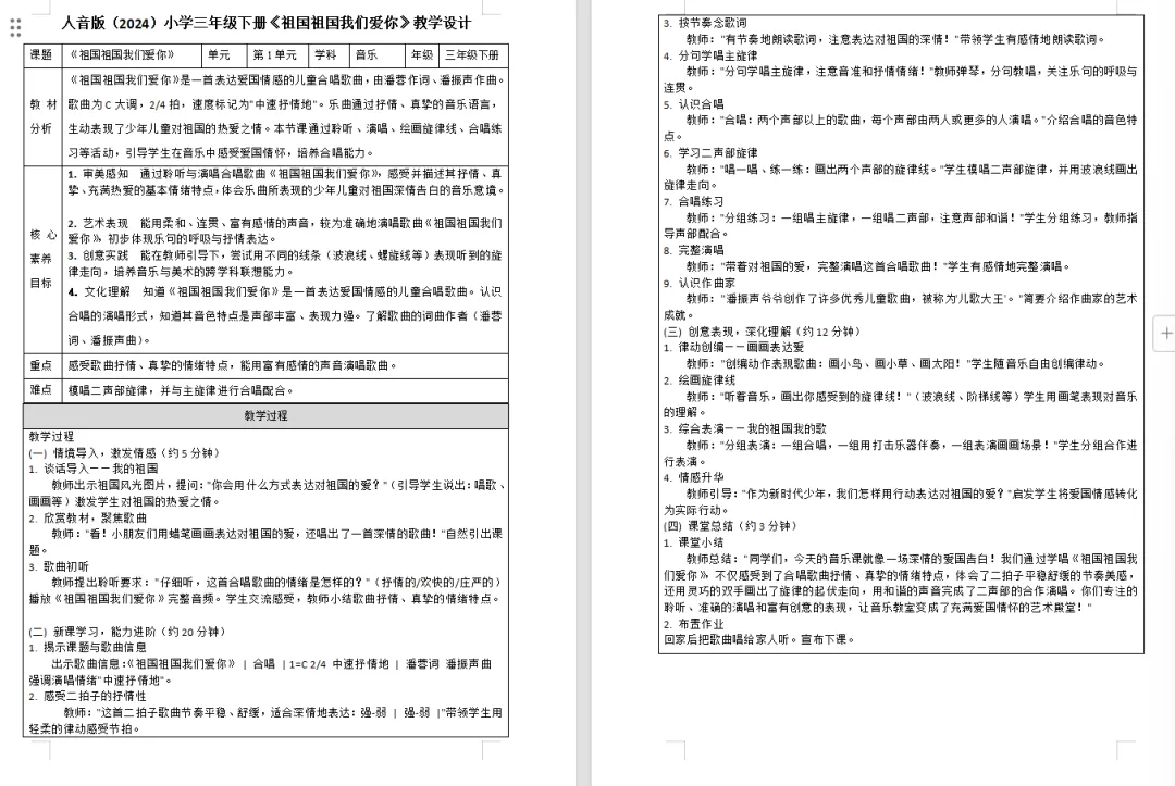 【音乐教案课件】新教材人音版小学音乐三年级下册表格配套教案课件(含反思)第1课《祖国祖国我们爱你》
