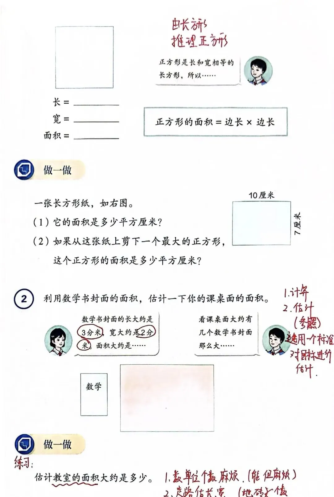 老师们提出,"面积"单元不是直接教公式,而是设计了从"统一测量标准的必要性"→"面积单位产生"→"公式探索"的完整认知链条!教材中"用大小不同方格测量同一物体引发认知冲突"的案例,指出了什么才是真正的思维引爆点!