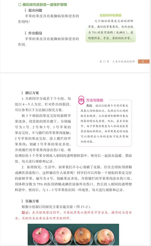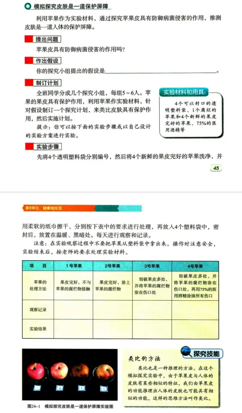 再先看旧教材:这个实验是分4组,直接用4个苹果做实验。其实设计3组实验、用3个苹果就可完成该实验的探究并得出结论了!
