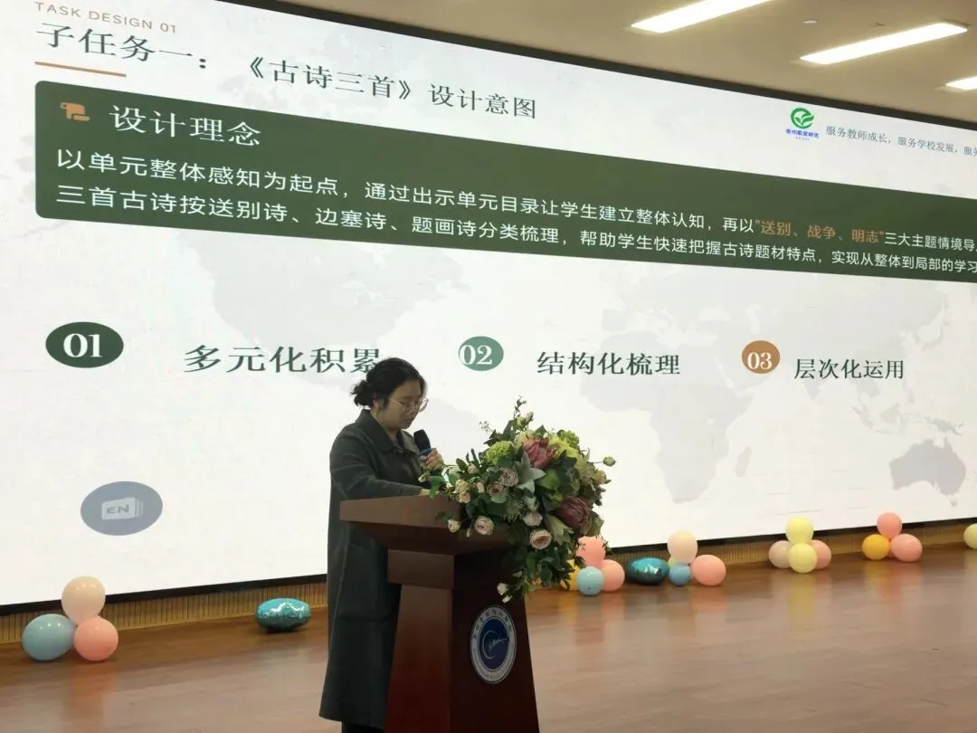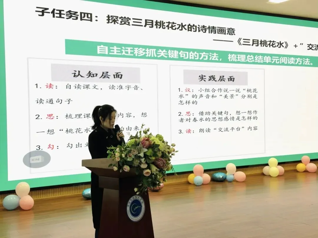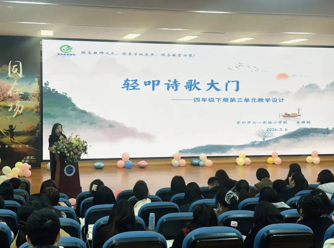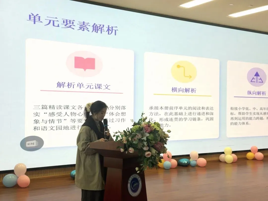 学府小学陈之奕老师带来了四年级下册第二单元的教学设计分享。她以“问启思辨,创见科学”为主题,为大家呈现了兼具深度与温度的单元教学范例。七一实验小学宋丽娟老师以“轻叩诗歌大门”为主题,分享了四年级下册第三单元的教学设计。为老师们打开了一扇通往诗意语文的新窗口。