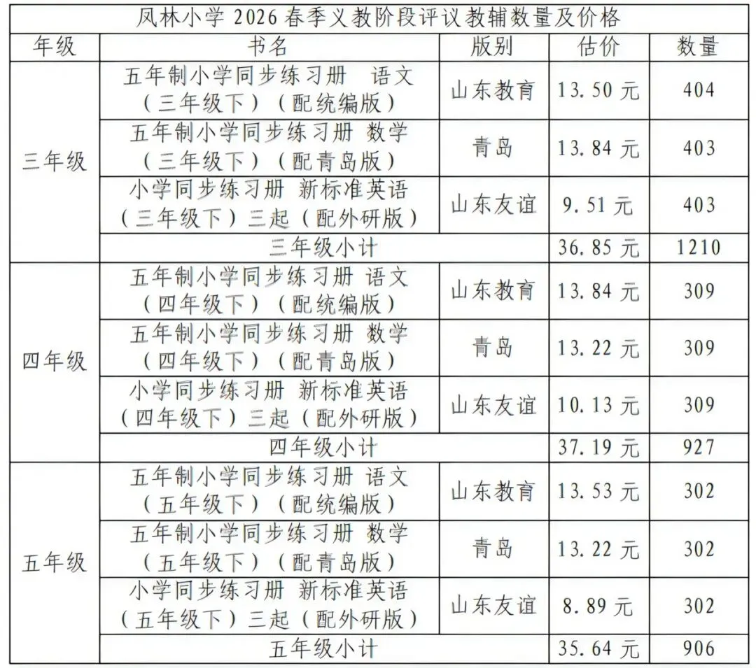 凤林小学2026年春季教辅征订明细公示
